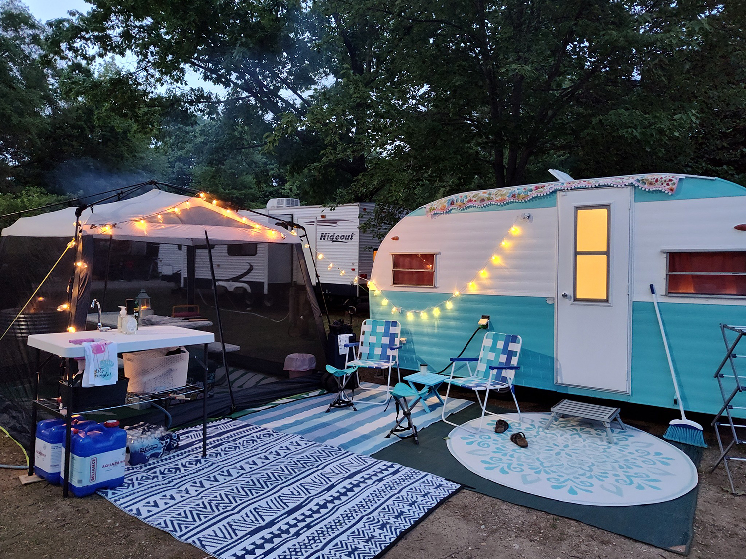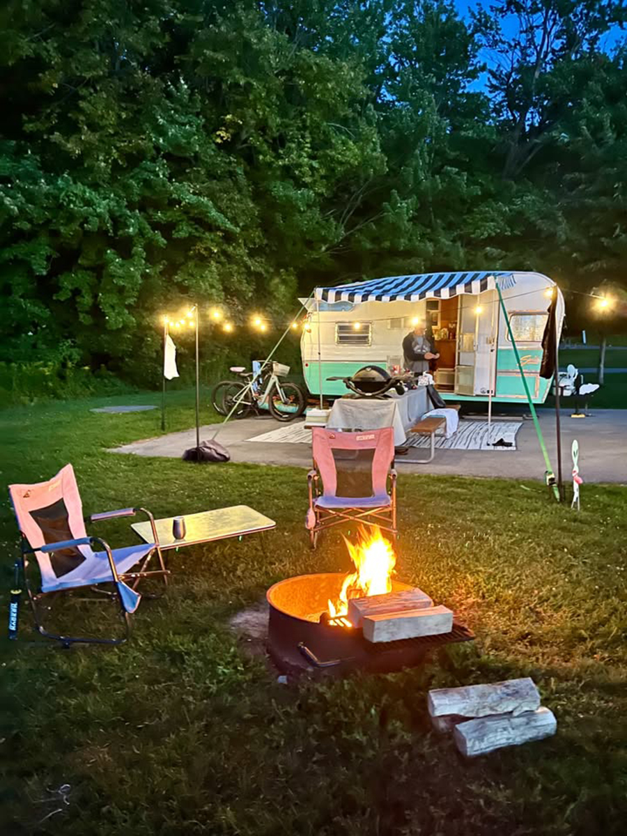 Few things beat the glow of a camper lit by string lights and a nearby fire. This turquoise-and-white trailer shines against the night sky, while a black-and-white striped awning adds a dash of flair. Folding chairs, a picnic bench, and a cozy rug make the firepit area feel like a second living room. It’s the perfect mix of comfort and retro charm.
