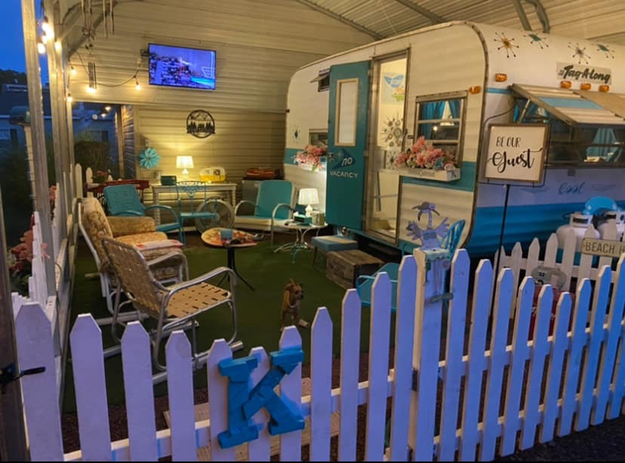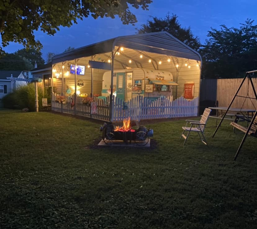 This setup looks more like a backyard than a campsite. The camper itself is turquoise and white, but the real magic is the pavilion built around it. String lights glow overhead, while white fencing frames the outdoor space. Comfy seating and a firepit make it feel like a permanent getaway. It’s comfort, style, and camping rolled into one.