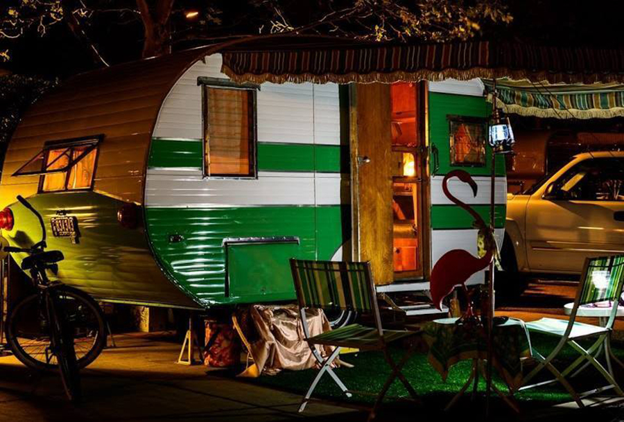Bold green stripes give this camper its retro edge. The glossy finish pairs beautifully with the warm wood door, glowing softly under the lights. A striped awning and matching chairs extend the charm outdoors. Add in a pink flamingo and classic table, and you’ve got a scene that feels like a vintage road trip come to life—fun, timeless, and full of personality.