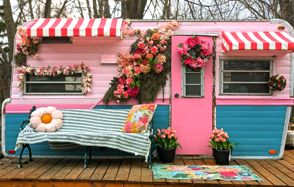 This one looks like a rolling garden. The pink-and-teal paint sets a cheerful tone, while red-striped awnings add charm. Wreaths, garlands, and overflowing flowers steal the show, spilling across the exterior. A striped bench cushion, pastel rug, and potted tulips finish the fairytale look. It’s romantic, playful, and unforgettable.