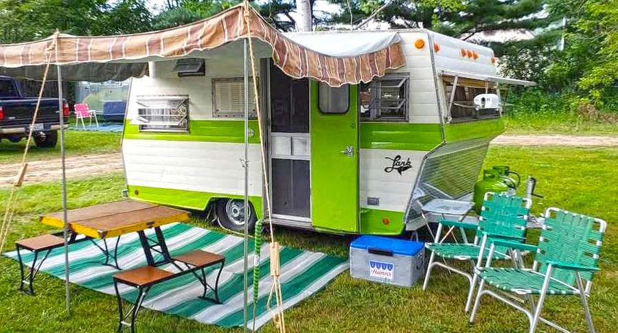This camper proves how one bold color can change everything. The fresh green pops against the white siding, giving it a lively retro vibe. A brown-striped awning softens the look, while matching chairs and a picnic rug tie it all together. With neat lines and coordinated accents, it feels nostalgic yet practical—a classic nod to vintage camping.