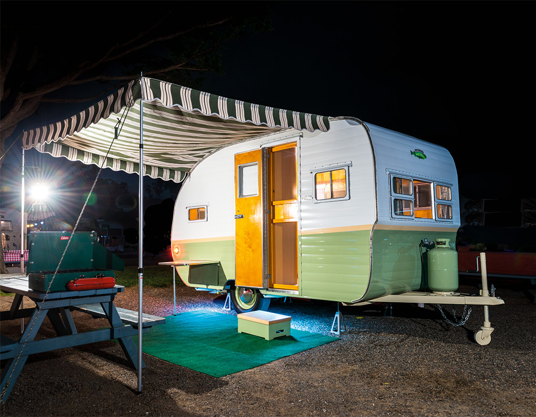 This design shines with elegance. The white-and-green body feels fresh, while a golden wood door adds warmth. As the sun sets, the glow from inside spills onto the striped awning and outdoor rug, creating a welcoming scene. Small touches like the propane tank and picnic table keep the look grounded in classic camping style. It’s nostalgic, modern, and full of charm after dark.