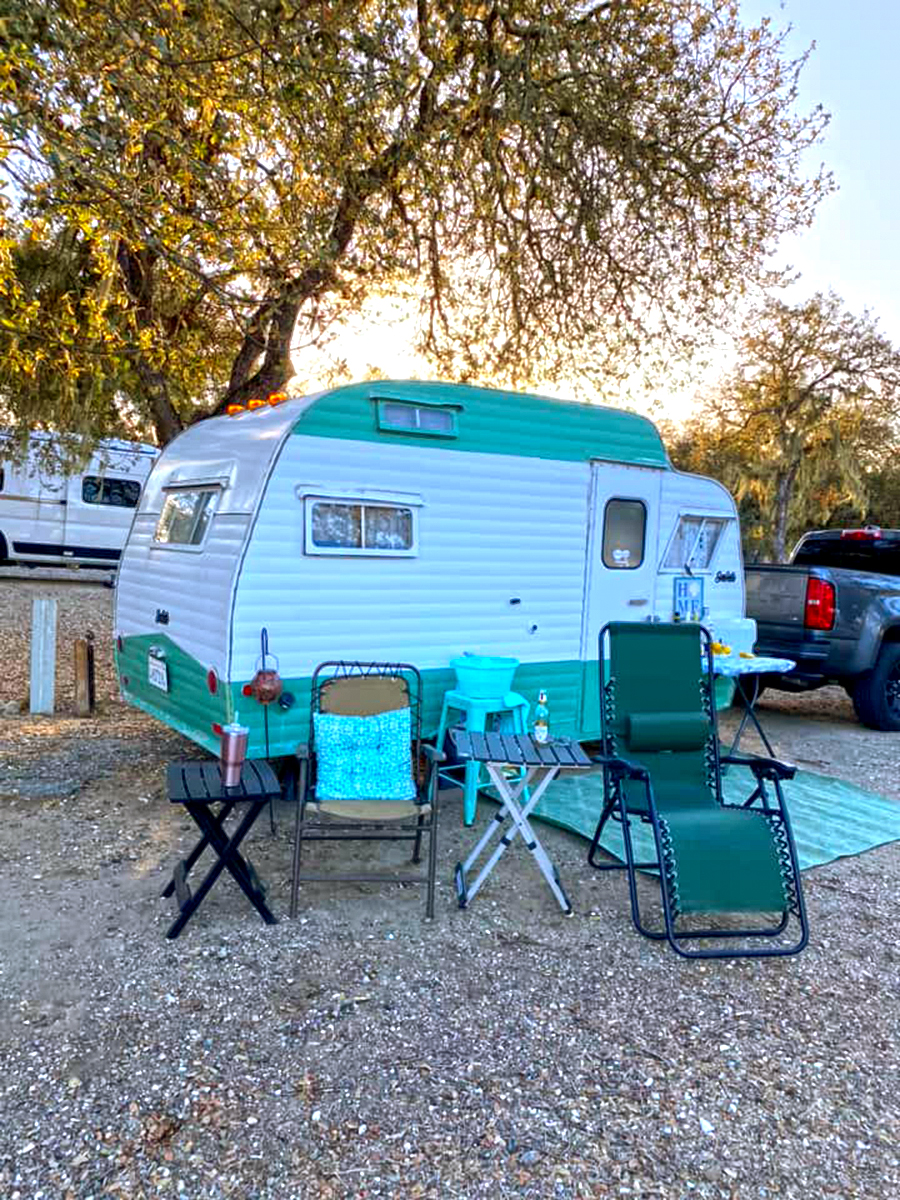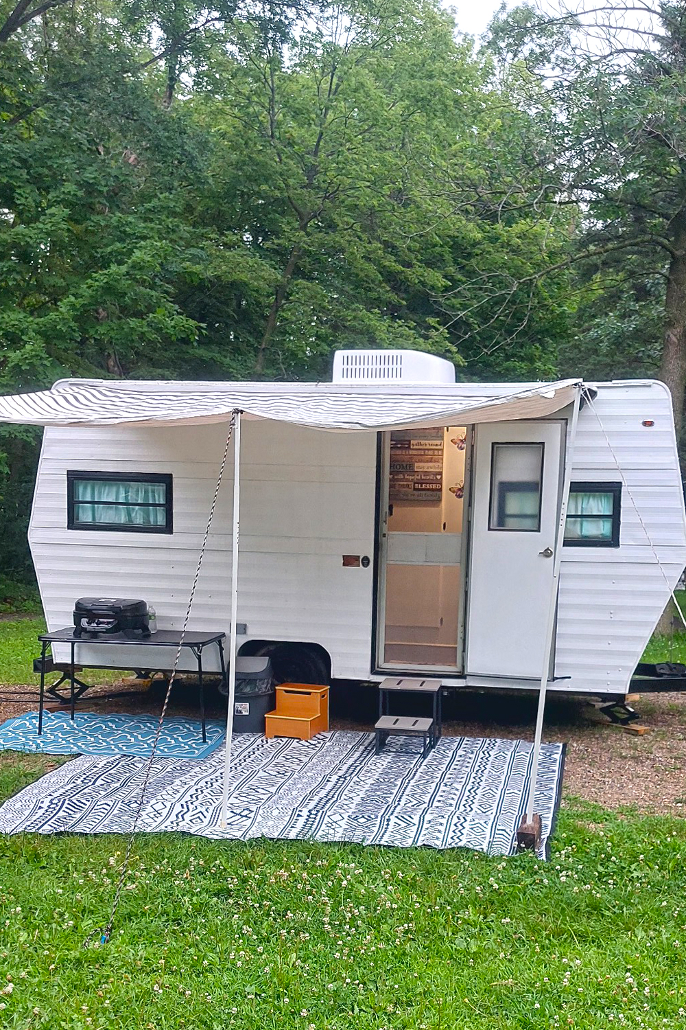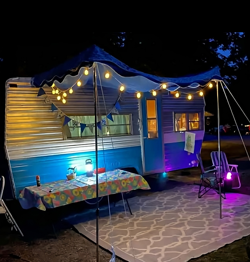 This camper leans into cool blue tones for a calming vibe. The turquoise door pops against the body, while a striped awning stretches out like a cozy porch. A large rug defines the seating area, and vintage metal chairs add retro charm. At night, string lights with colorful shades bring the space to life. It’s proof that color and texture can turn even a simple camper into a stylish retreat.
