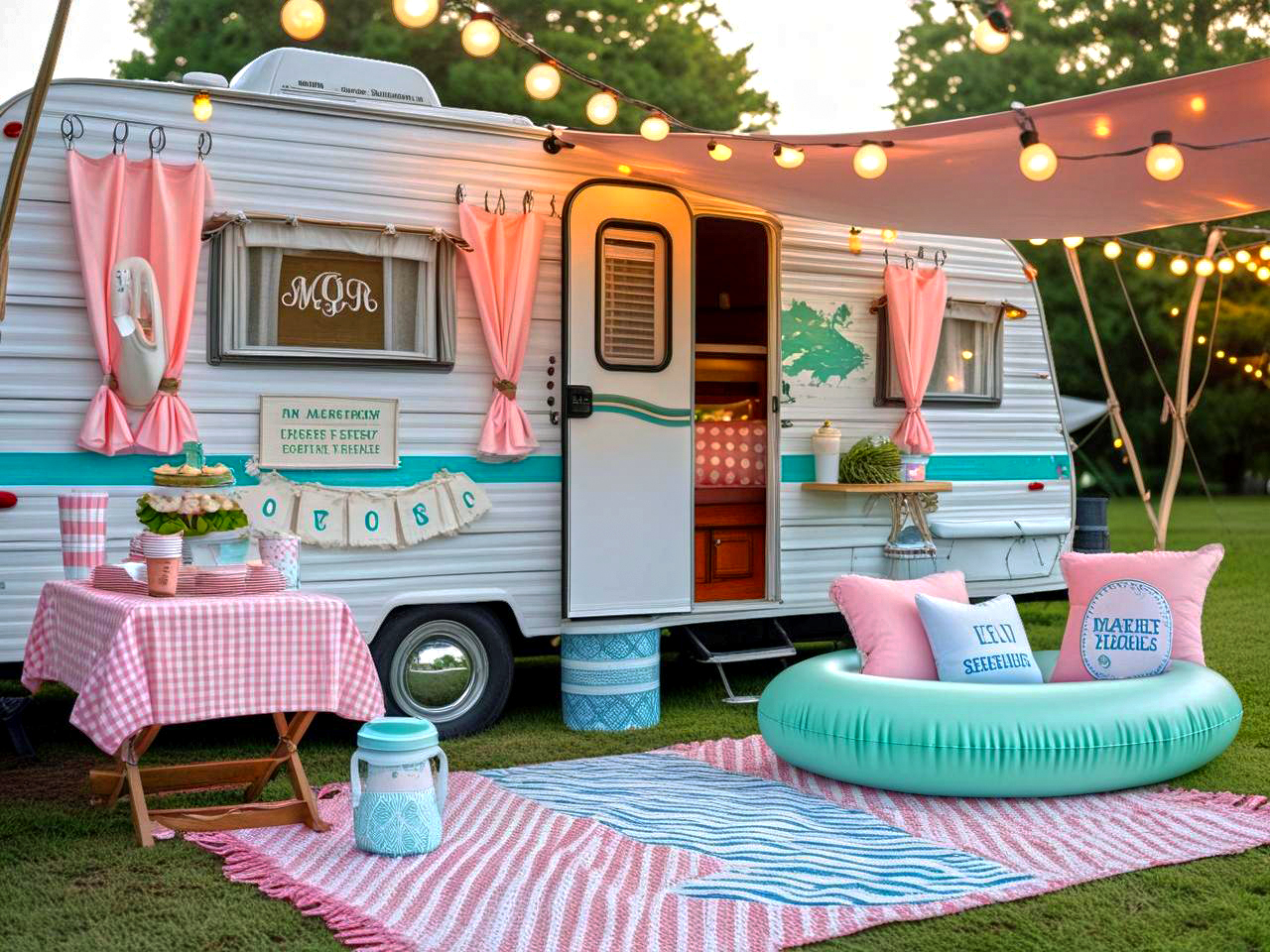 This camper looks like a retro dollhouse on wheels. White siding with teal stripes sets a fresh stage, while soft pink curtains add sweetness. Twinkle lights create evening magic. Outside, pink gingham tablecloths, pastel rugs, and playful pillows carry the theme. It’s charming, whimsical, and designed to bring instant smiles.