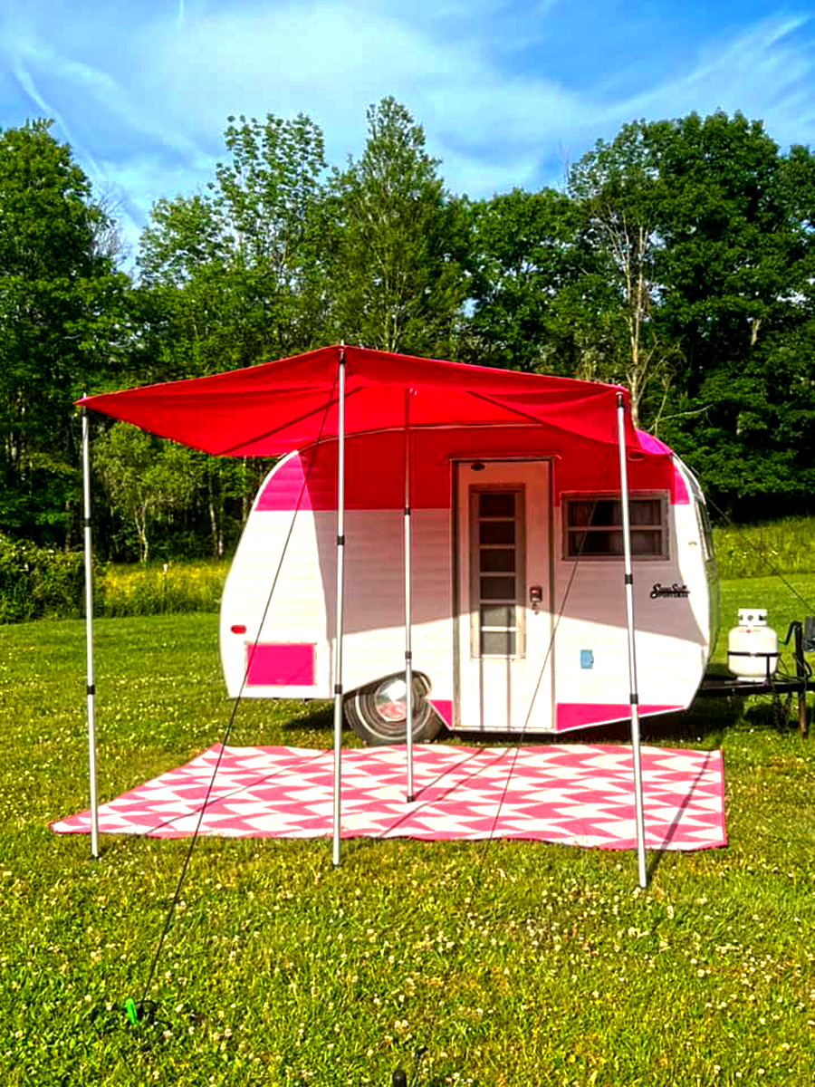 Nothing says fun like this pink-and-white camper. Bright magenta accents jump out against the white siding, giving it a lively retro feel. A bold awning and geometric rug pull the colors together, making the setup pop. The simple camper body highlights its vintage roots, while the fresh pink paint brings it into the present. Sometimes, all you need is one strong color choice to make a camper unforgettable.