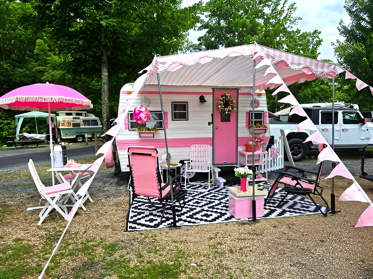 Sweet and playful, this camper dazzles with its pink-and-white paint. A scalloped awning sets the retro tone, while bunting flags add a touch of whimsy. Pink chairs, a floral wreath, and a patterned rug tie the look together. Even the umbrella and side table match the theme. When you commit to a palette, the result feels magical—and this setup proves it.