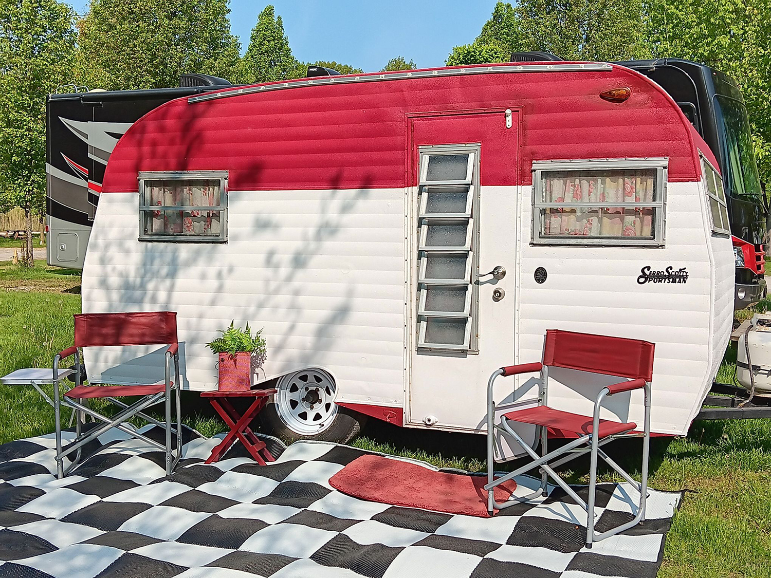 Bold and bright, this red-and-white camper makes a statement. The deep red upper half pops against the clean white siding. A checkered rug stretches across the ground, reinforcing the retro theme. Matching red chairs and even a planter add to its nostalgic charm. With the right palette, this trailer proves simple can be stunning.