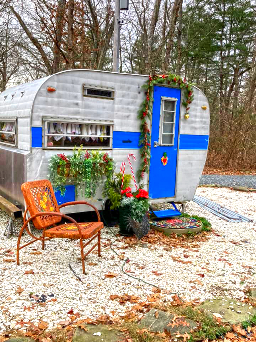 This trailer embraces its roots. The aluminum siding shines with vintage character, while a cobalt blue stripe and matching door bring energy. Seasonal greenery and holiday décor make it feel lived-in and loved. A retro chair outside ties it together. By mixing original features with bold accents, this camper keeps its history alive while adding fresh personality.