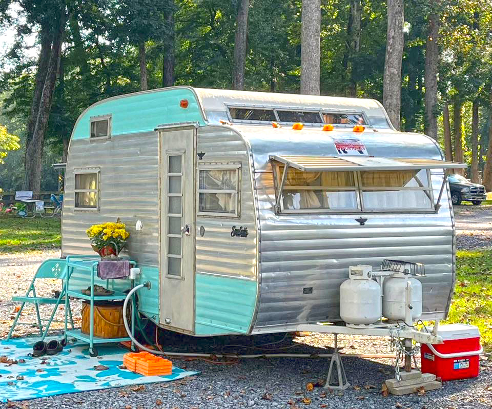 This camper turns heads with its polished aluminum body that gleams in the sun. Aqua accents along the bottom and roofline bring in a fresh, coastal feel. Classic windows with awnings keep it shaded while holding onto retro style. A turquoise bistro set and floral centerpiece create the perfect outdoor nook. It proves that shine, color, and a few thoughtful touches are all you need.
