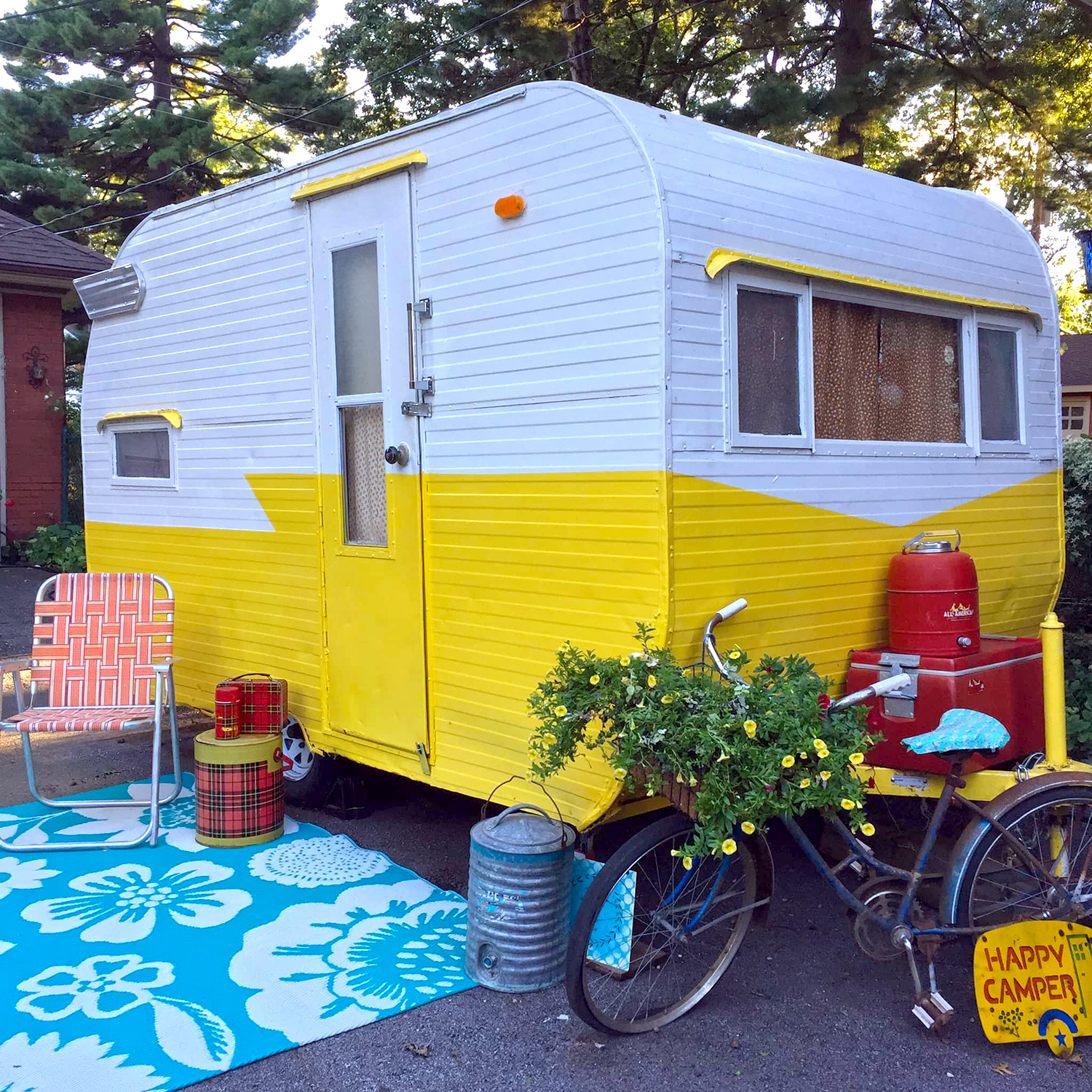 This one radiates pure joy. Bright yellow paired with white makes the camper pop, while an angled stripe adds a fun geometric touch. A yellow door ties it all together. Outside, a floral rug, plaid tins, and a flower-filled bike create postcard-perfect charm. It’s cheerful, retro, and impossible not to love.