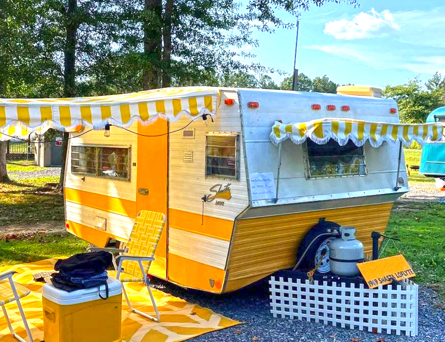 This trailer beams with happiness. Yellow-and-white paint creates a cheerful glow, while angled yellow paneling adds a fun geometric touch. A scalloped awning softens the design with charm. Outside, vintage chairs, a yellow cooler, and a matching rug expand the color scheme. It’s sunshine on wheels—bright, bold, and full of retro energy.