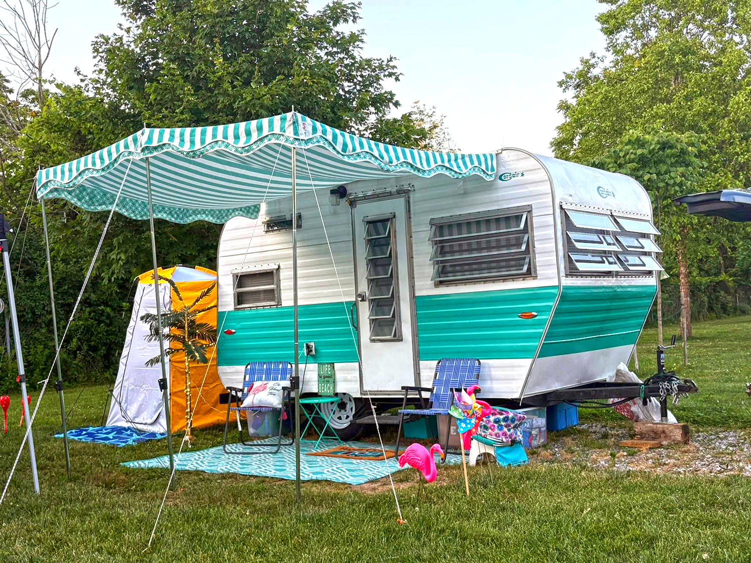 Here’s proof that small details change everything. A striped awning stretches out to create shade and style, turning the space into a front porch on the go. The blue-and-white colors match the flower box, keeping the look fresh and fun. A bold mat anchors the setup, while flamingo lights strung across the awning add whimsy. This camper is equal parts cozy retreat and retro hangout.