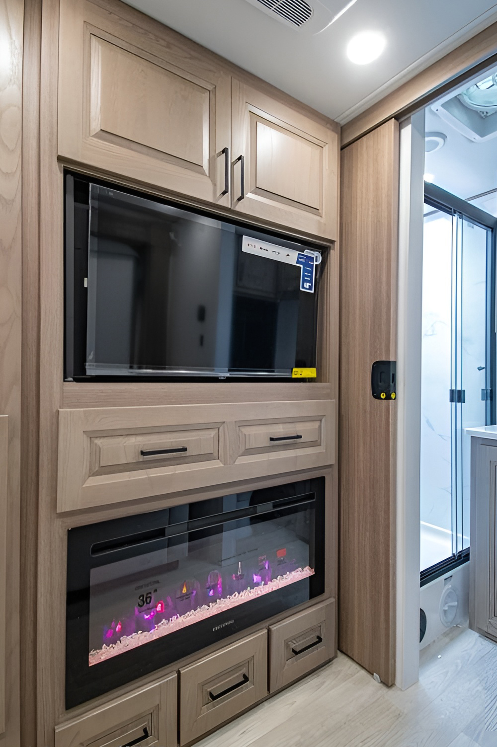 Yes, you can have a fireplace in an RV! Electric fireplaces add warmth and style to living rooms, all with the flick of a switch. The gentle glow makes evenings extra cozy.
