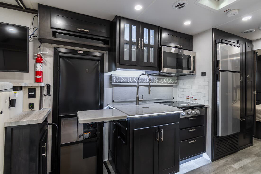 Cook real meals with propane, induction, or electric cooktops. Some motorhomes include ovens—perfect for baking or roasting. Convection microwaves are common in compact models.