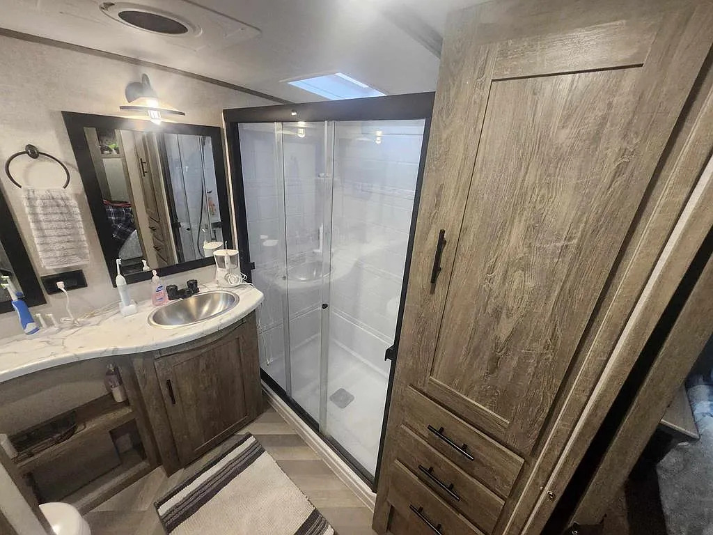A tall linen cabinet sits next to the shower for extra storage—something rare in most RVs. Soft lighting and a framed mirror complete the space beautifully.