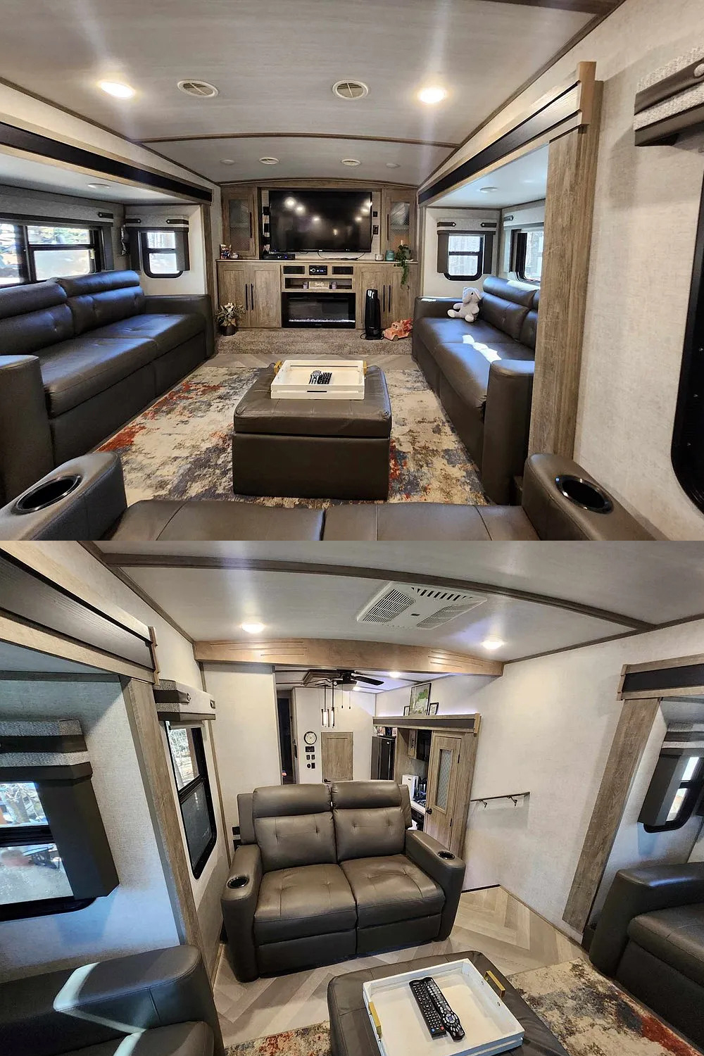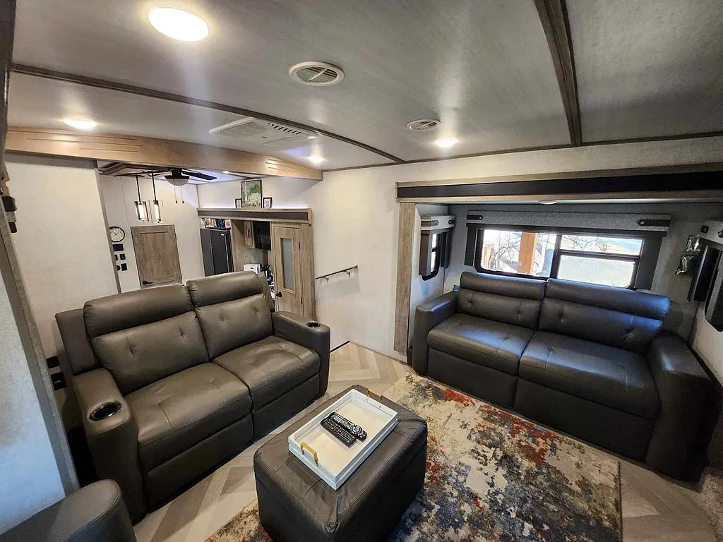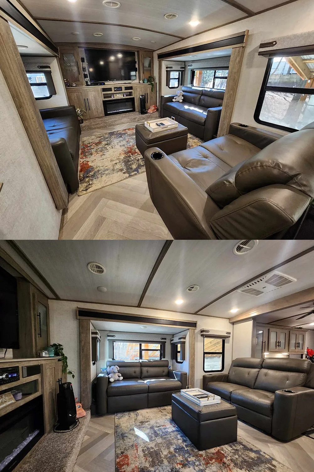 The living room is the heart of this camper. Two leather sofas—one with built-in recliners—face each other for the perfect setup. A colorful rug on the floor adds warmth, and an ottoman doubles as a coffee table and footrest.