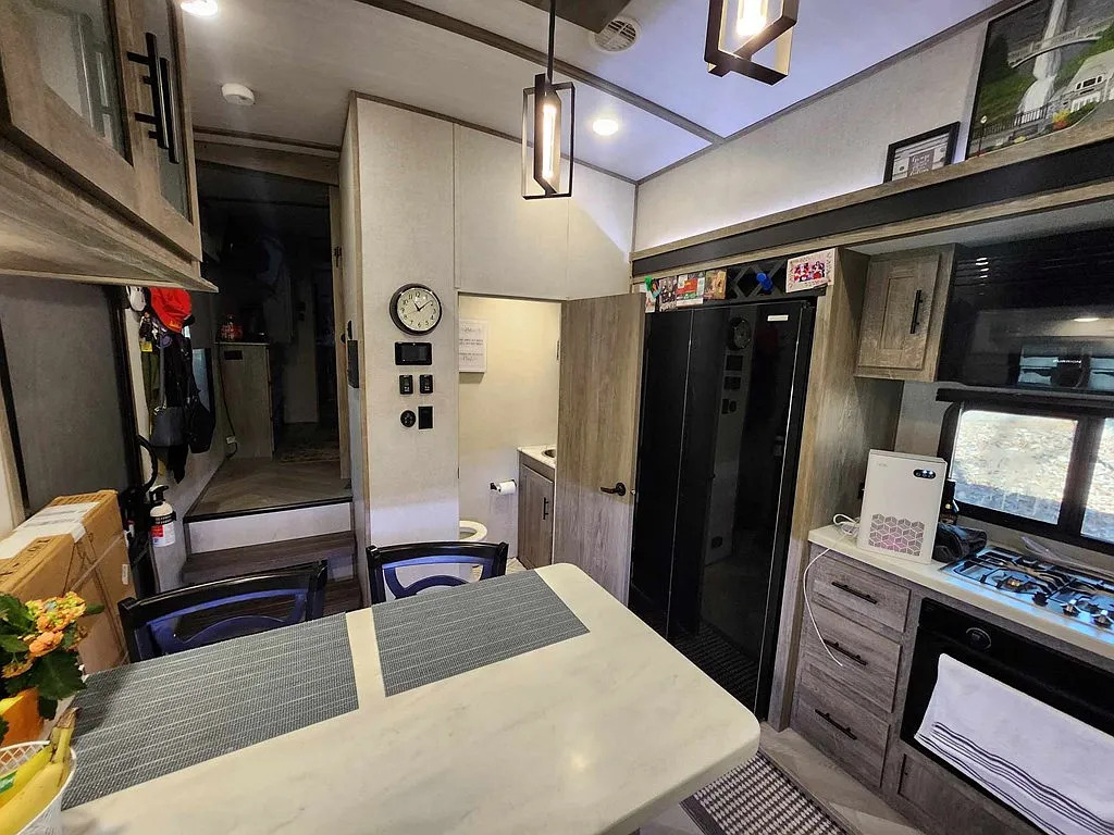 The large double-door fridge is a total win—it’s roomy enough for full-time living. There’s also a gas stove, microwave, and lots of storage space for cooking gear and snacks.