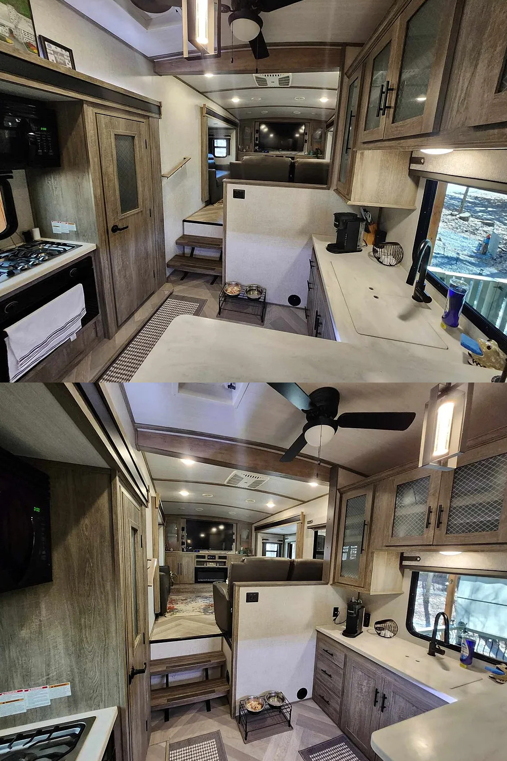 This 5th wheel camper makeover shows what’s possible when comfort meets creativity. The owners turned a standard trailer into a true home—complete with charm, warmth, and modern style.