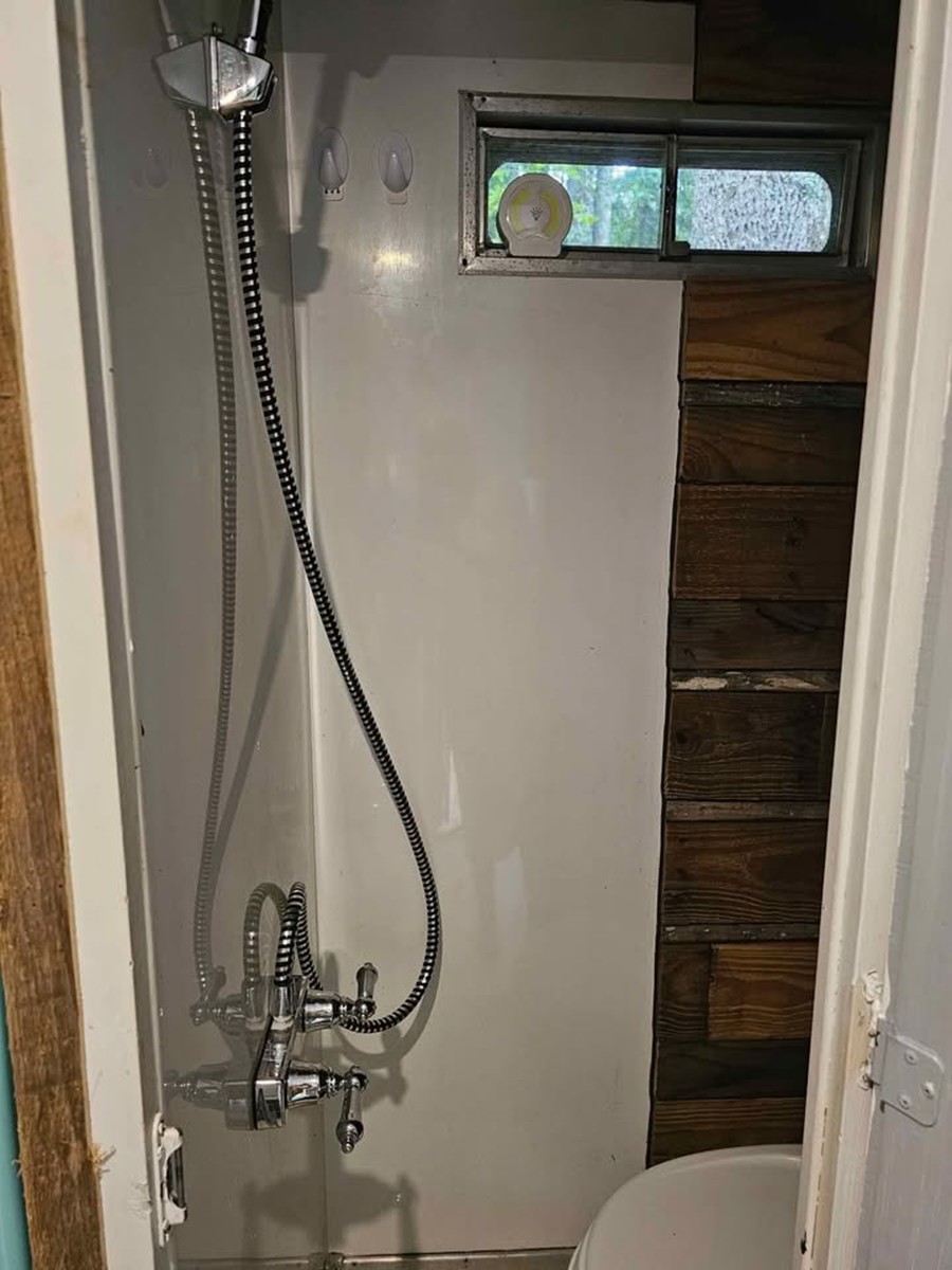 A small window brings in natural light, and a basic shower head setup makes washing up easy. The toilet is low-profile, likely a composting or RV-friendly model. Hooks and a shelf hold soap, shampoo, and towels—just what you need and nothing more.