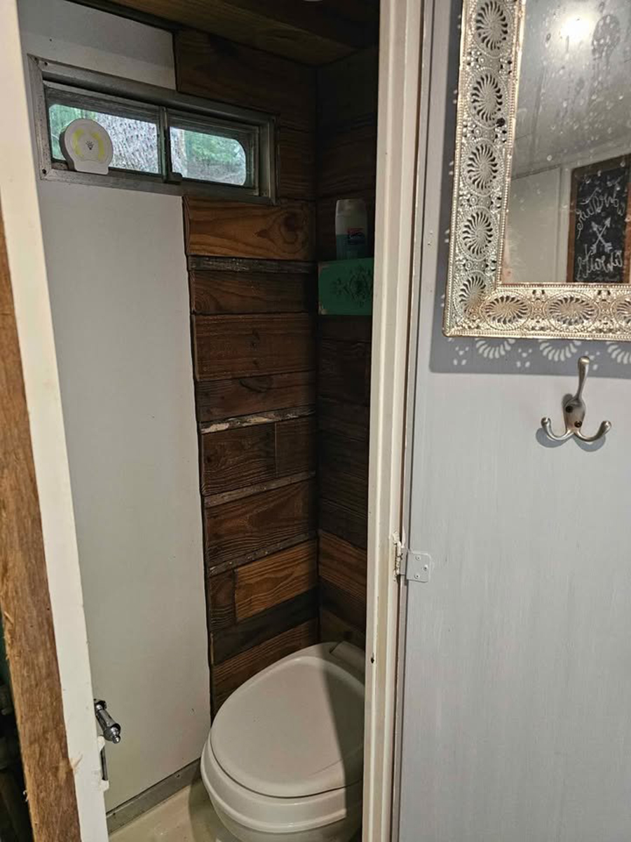 Yes, this camper has a bathroom! It’s compact, but it gets the job done. The walls are part white panel, part wood, which keeps the look consistent with the rest of the camper.