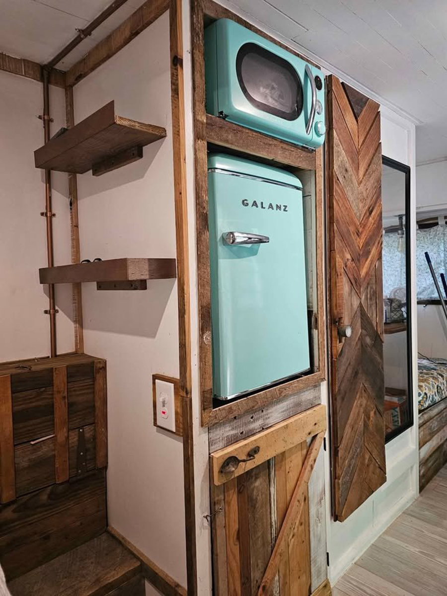Storage in a camper matters—and this one nails it. Overhead cabinets above the sink keep dishes and dry goods tucked away. A compact fridge and matching retro microwave fit neatly in custom wood framing across from the kitchen. They blend in like built-in furniture.