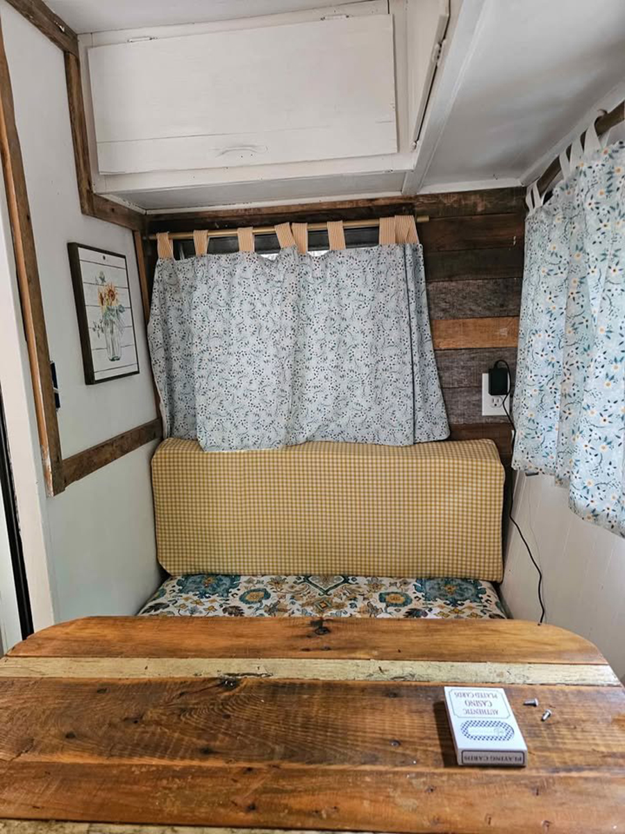 The dining area has a solid wood table and padded benches on each side. The mix of gingham cushions and floral fabric on the bench backs makes it feel like a cheerful farmhouse booth. The table is the perfect spot for meals, games, or planning your next road trip.