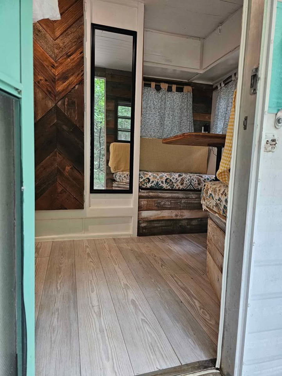 The floors throughout the camper look like real wood but are actually vinyl. That means they’re easy to clean, waterproof, and made to last. The pale wood tone makes the space feel fresh and adds to the light, airy look. It also matches beautifully with the other wood finishes inside.
