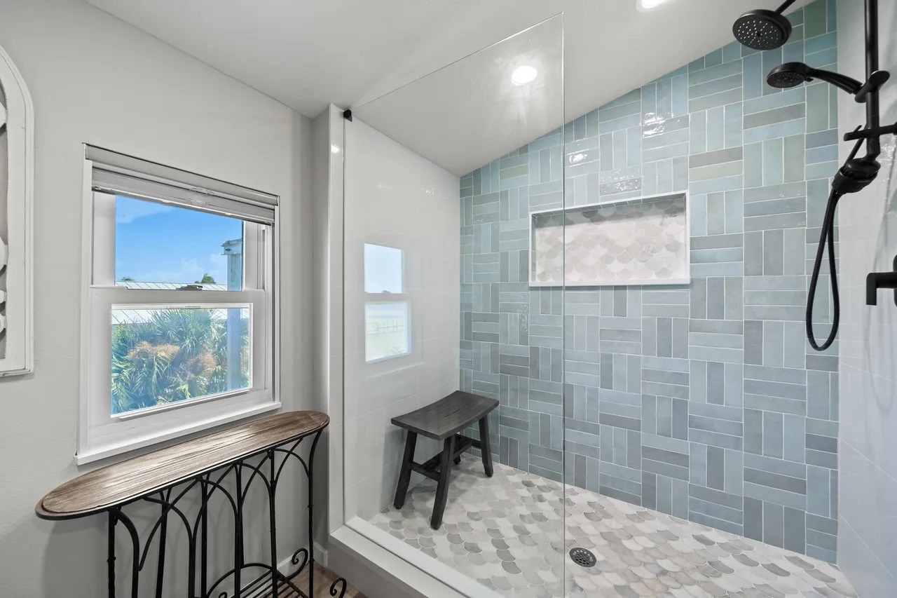 Step into the walk-in shower, and you’ll find blue-green tiles arranged in a playful, geometric pattern. The built-in niche holds all the essentials, while the pebble-tile floor feels good underfoot. A simple wood bench offers both function and style, perfect for relaxing in the steam or keeping towels close at hand.