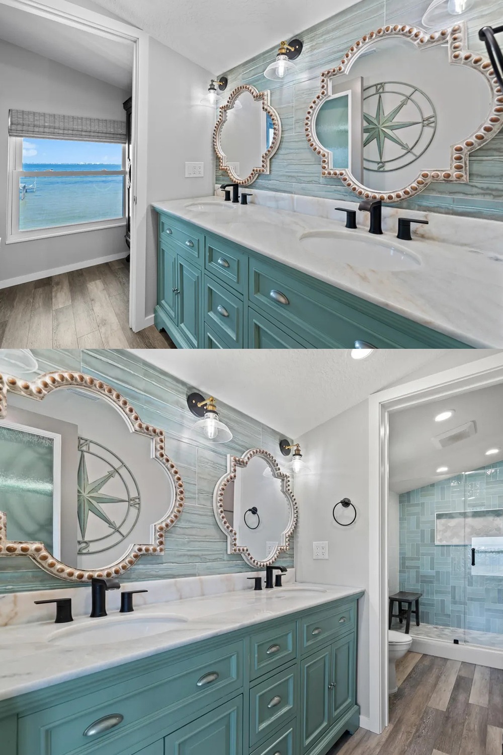 The bathroom feels like a spa retreat. Twin mirrors with shell accents hang above a long, aqua-blue double vanity. The countertop is creamy quartz, giving plenty of space for everyday essentials. The backsplash tile, done in a wave pattern, adds texture and a soft shimmer.