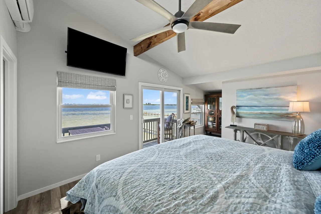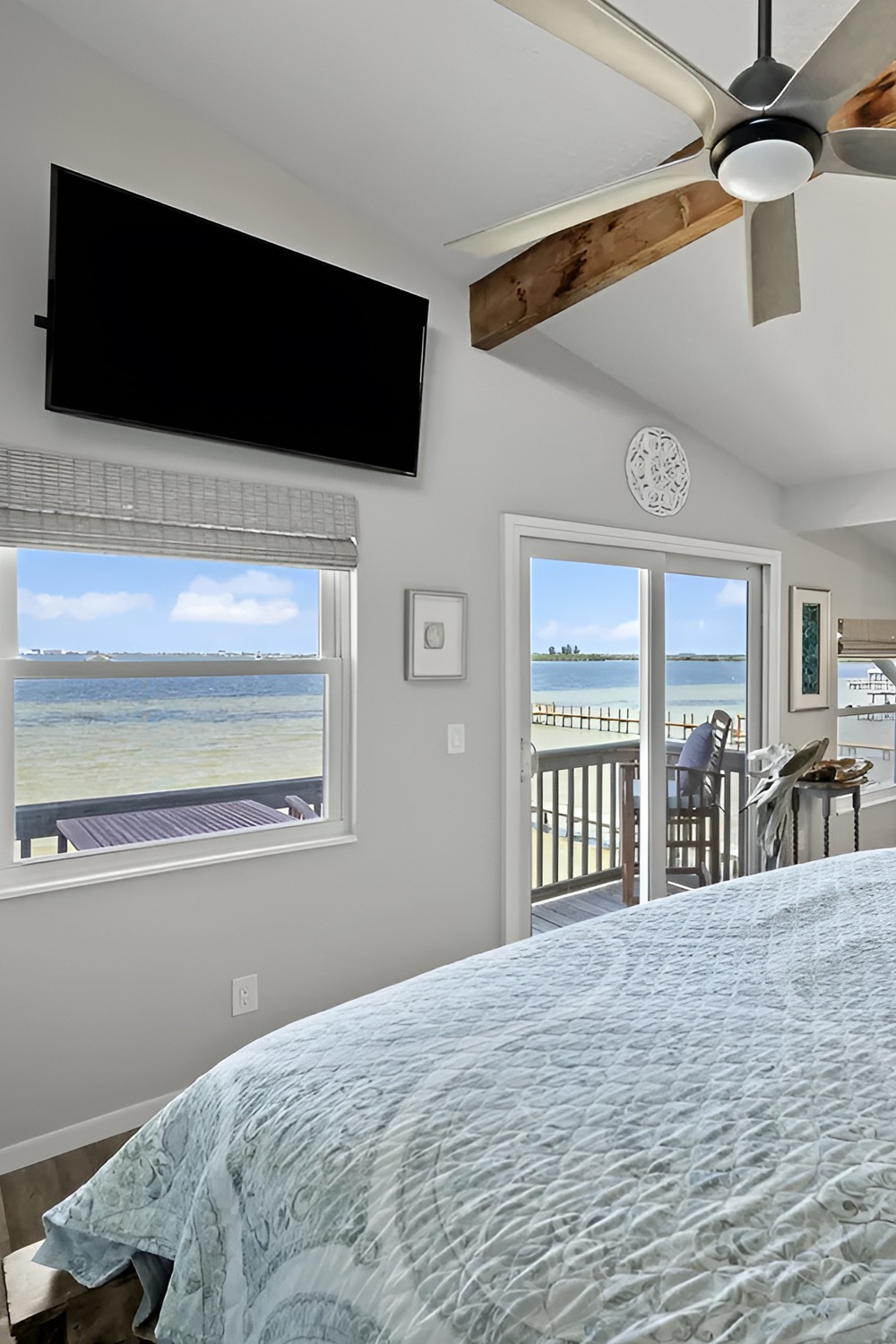 Sliding glass doors open straight to a private balcony over the water, letting in sea breezes and sunlight. Overhead, a natural wood beam gives the ceiling character and warmth. The simple rug underfoot keeps things cozy, while the ceiling fan provides a gentle, cooling breeze.