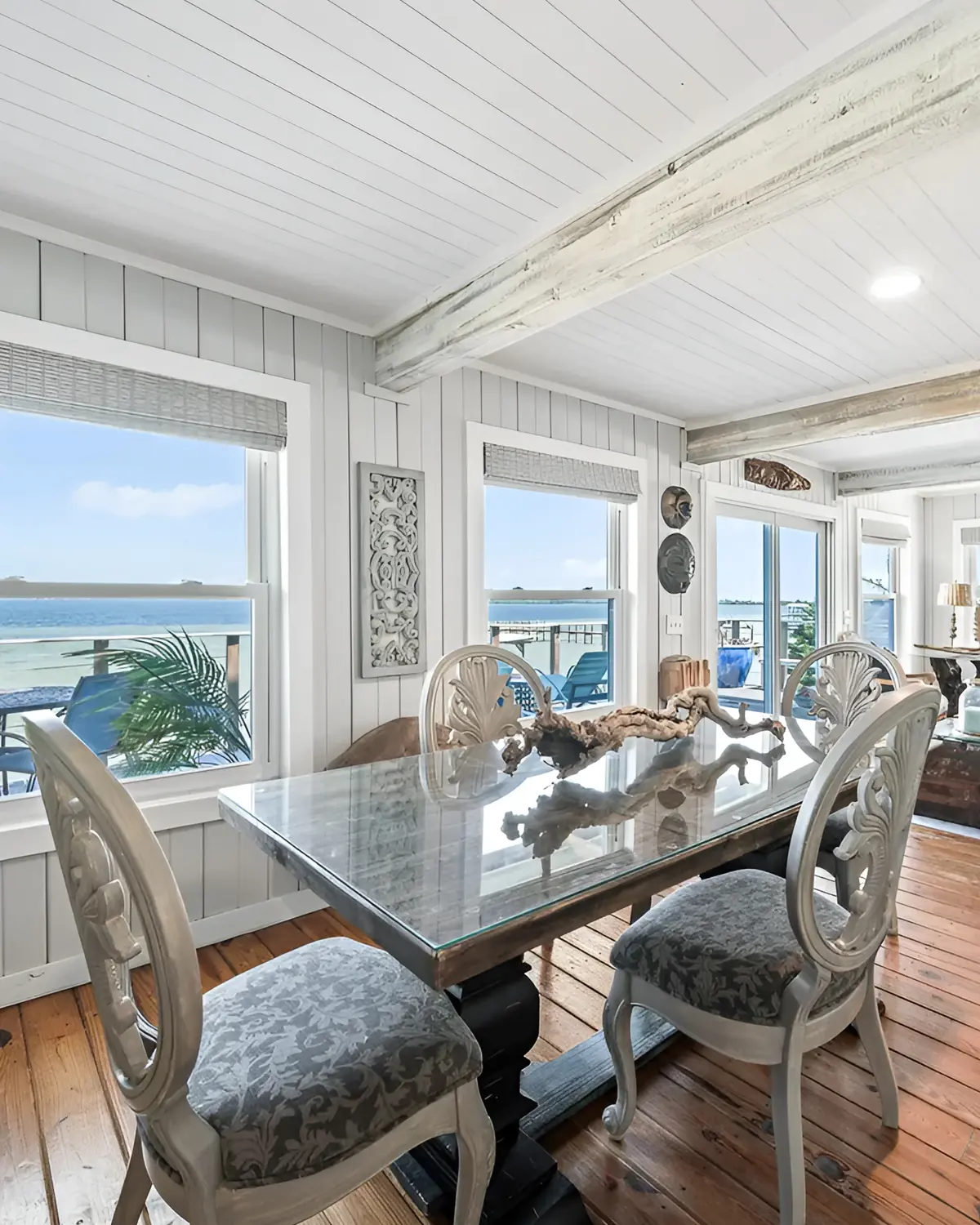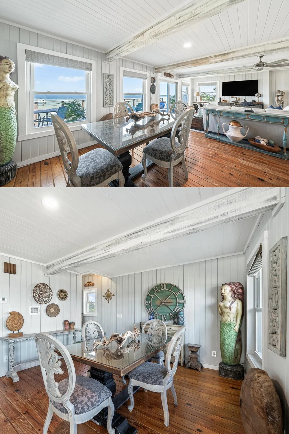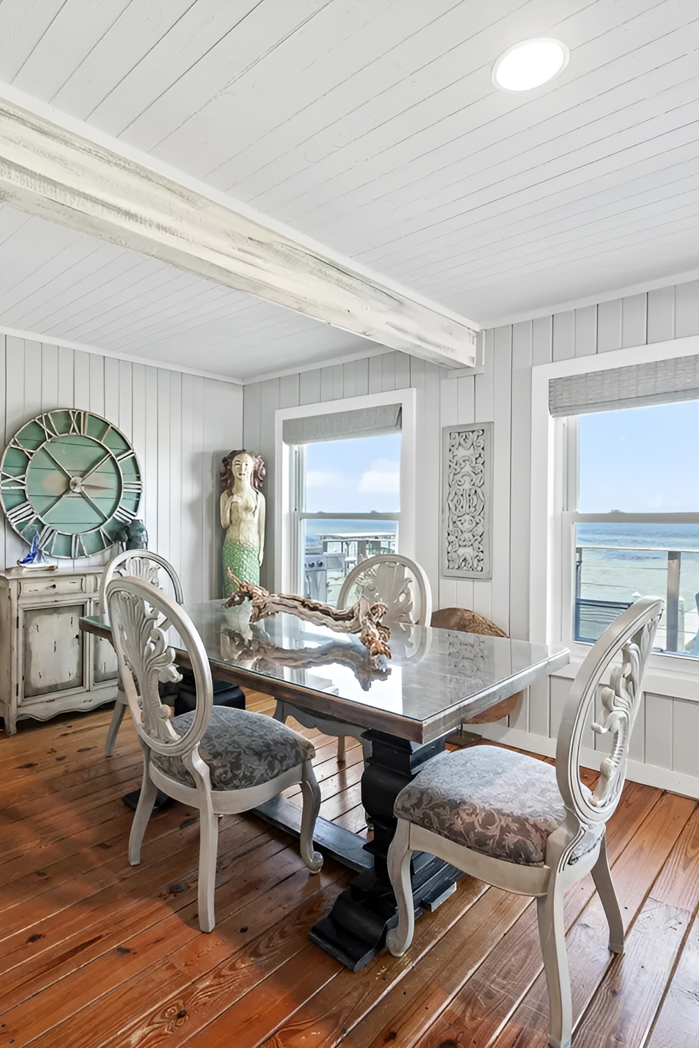 The dining space carries the same breezy vibe. Sunlight streams in from double windows, bouncing off painted wood paneling and highlighting the wide-plank floors. The dining table, topped with glass, feels both sturdy and light. Its pedestal base has a weathered black finish, offering a touch of drama.