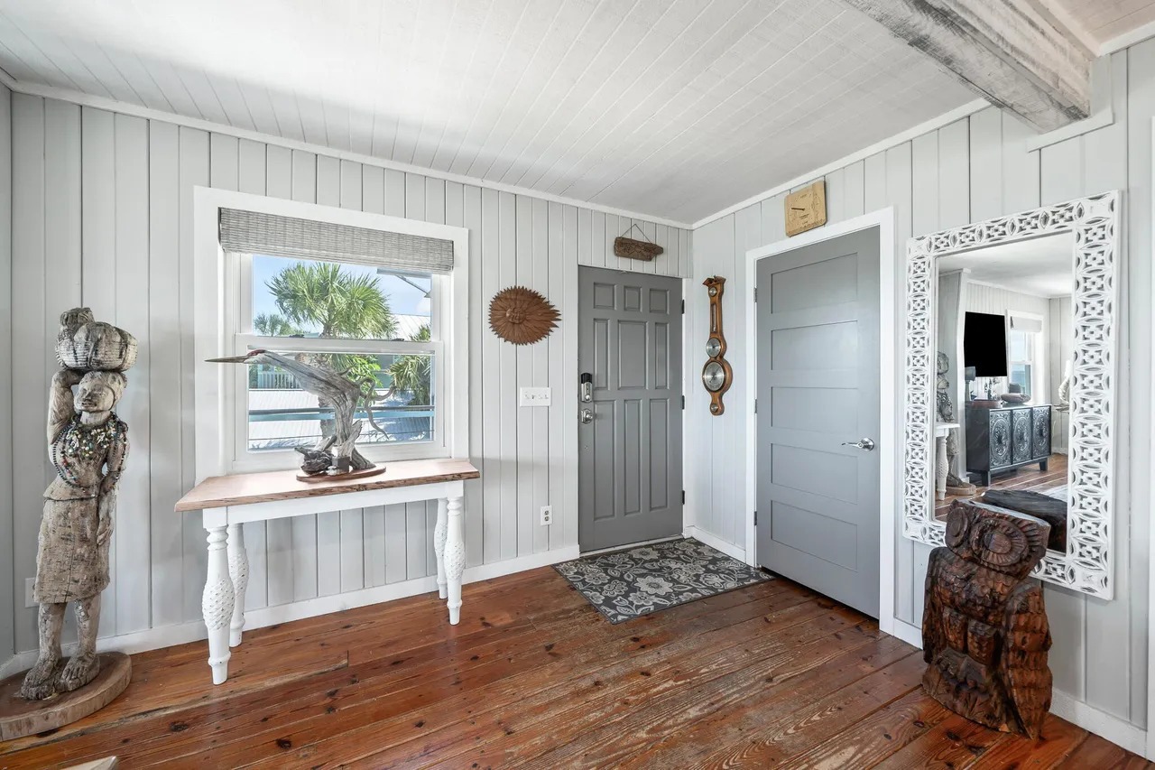 The entry area makes a statement right away. Wide-plank pine floors and vertical paneling set a classic tone. The gray front door and matching interior doors create a cohesive look, while the large carved mirror reflects light and opens up the space.