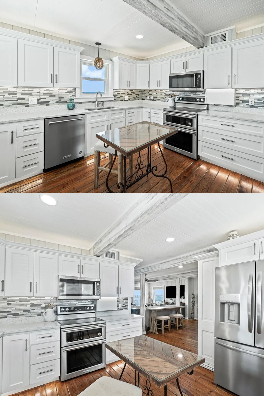 Stainless steel appliances offer a modern edge but don’t overpower the calm, cottage feel. A glass-topped center table with a wrought-iron base stands in as a kitchen island, proving you don’t need a massive space to have function and style. The soft gray walls and painted ceiling beams carry through the coastal theme, while pine floors add warmth and hint at the home’s relaxed, barefoot vibe.