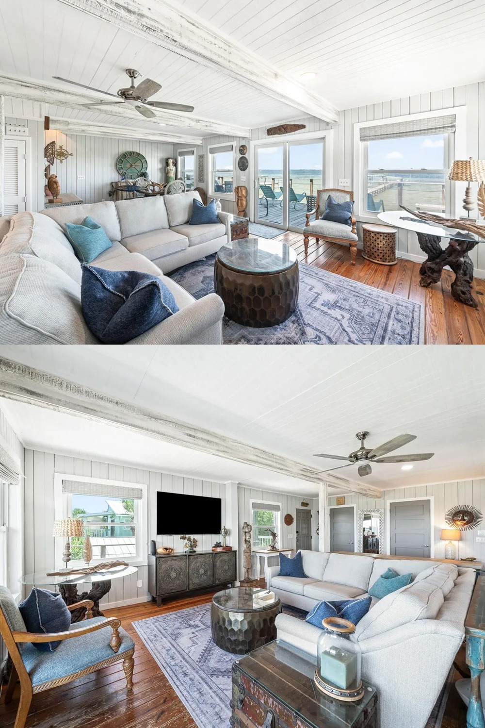 A large sectional sofa invites you to sink in and unwind, topped with plush, blue throw pillows that echo the sea just outside. The area rug adds a layer of coziness, tying the room together with a subtle beach-inspired pattern. Reclaimed wood accents—like the side tables and driftwood art—bring in a touch of nature, adding warmth and texture.