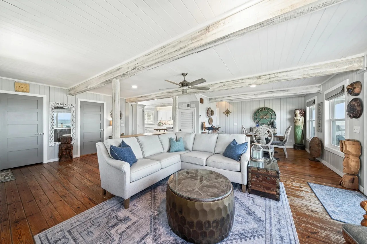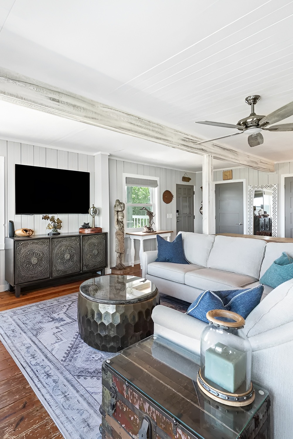 White paneled walls and distressed ceiling beams give the space a classic coastal cottage feel, while unique finds like a weathered trunk and a bold, honeycomb coffee table inject personality. Art and sculptures inspired by marine life—like the large sea-green clock and carved figures—remind you that you’re never far from the shore.
