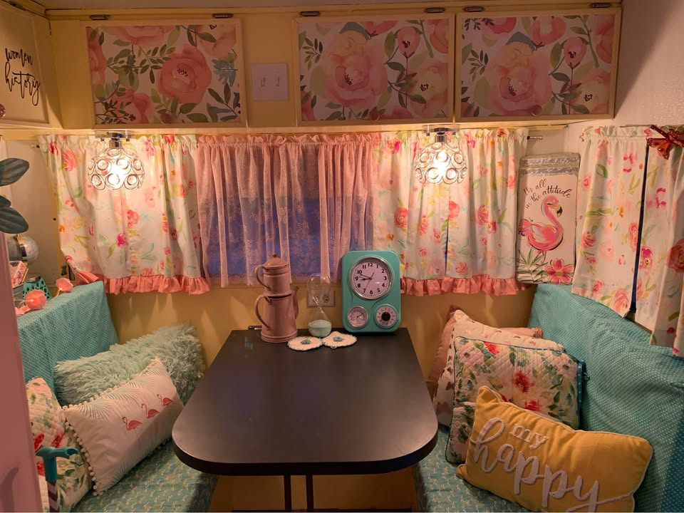 Turquoise seat pads sit under a mix of printed pillows. Some pillows have flowers. Some have flamingos. One bright yellow pillow says “my happy.” It fits the whole mood of the caravan.