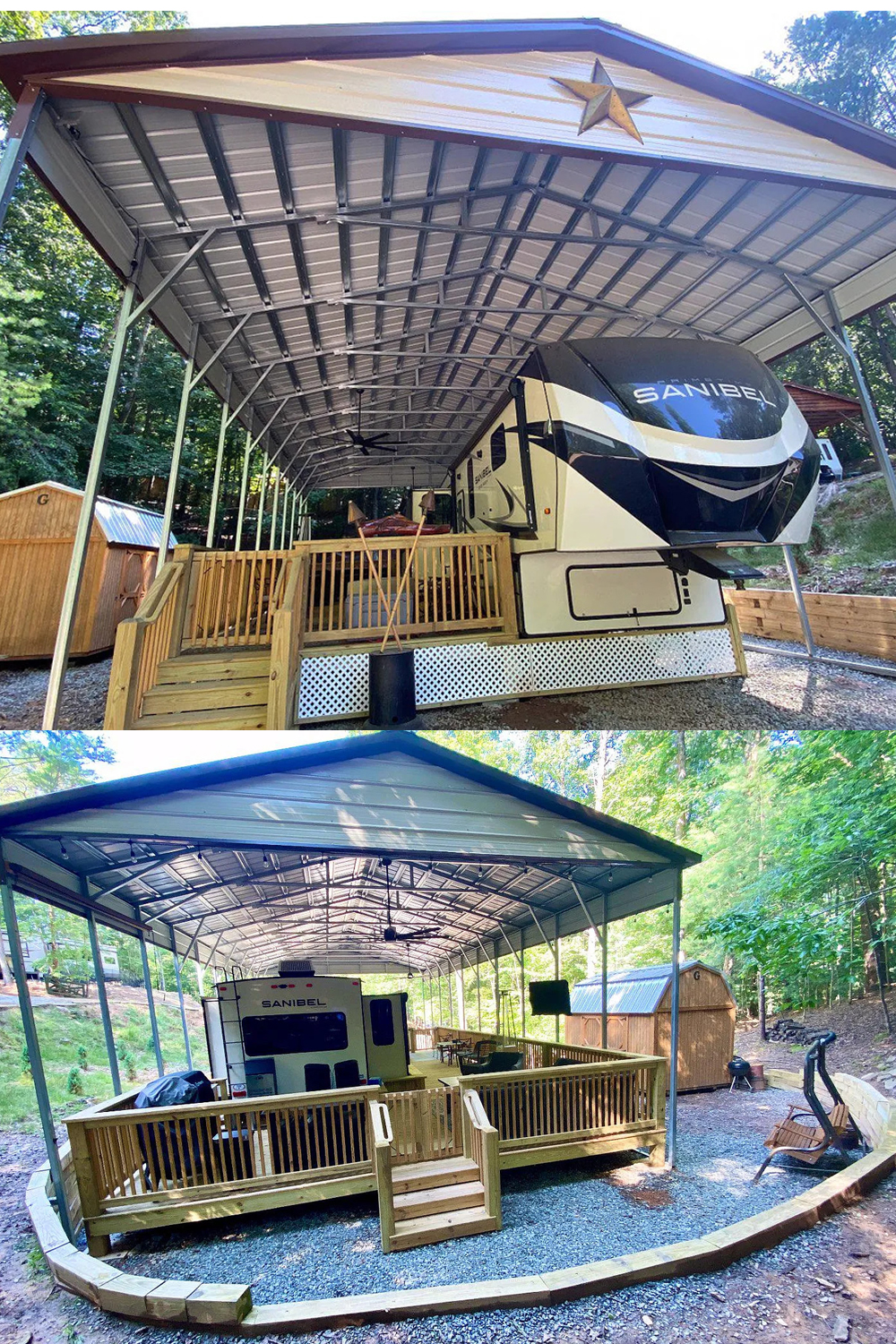 The first thing you’ll notice is the huge roof. It’s a strong metal canopy that covers the whole camper and deck. This roof is tall and wide. It keeps you dry when it rains. It also keeps you cool when the sun is hot.