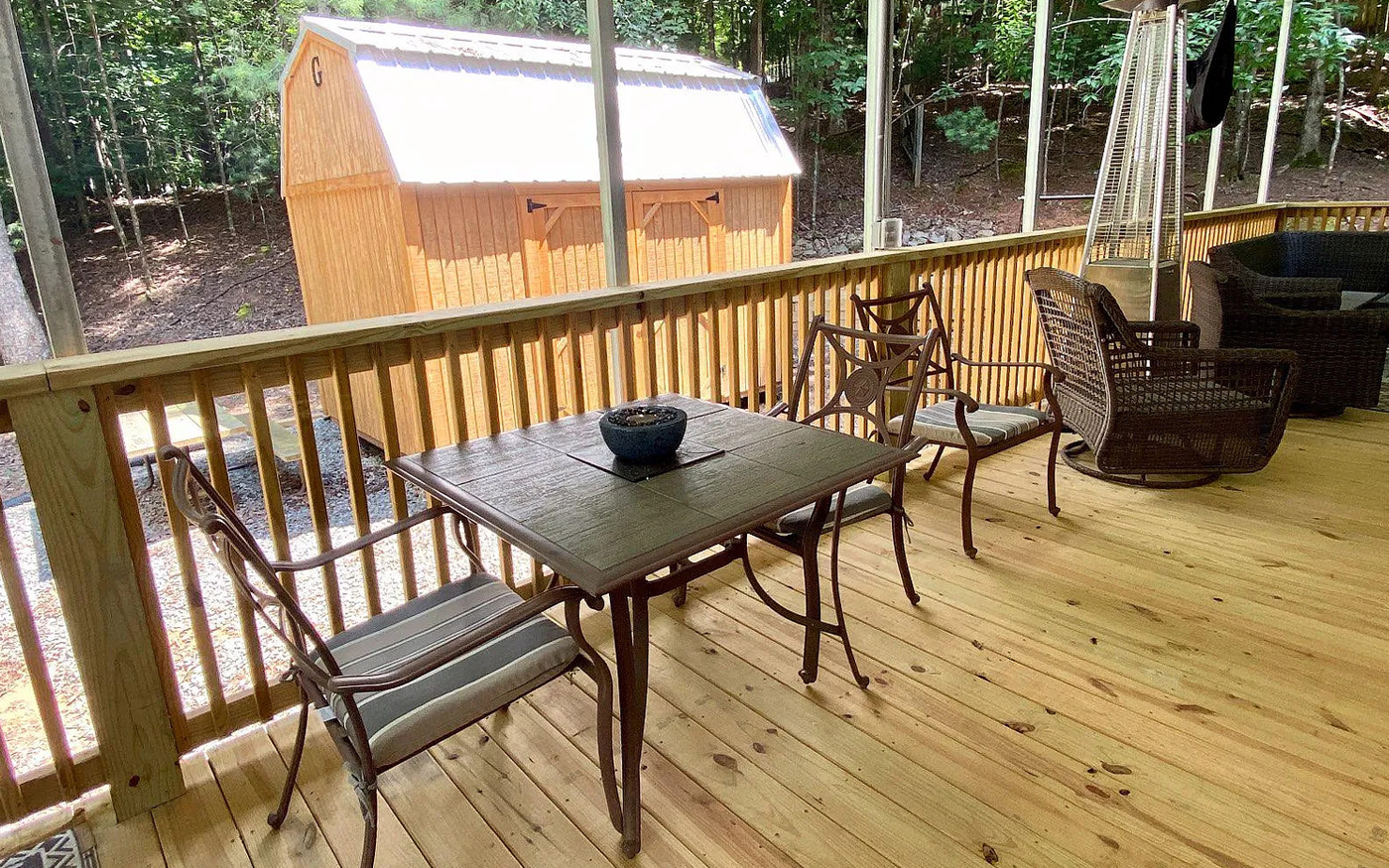 In the middle of the deck, you’ll find a square dining table. Four chairs fit around it. The chairs are soft, with comfy cushions. It’s the perfect place for a meal, morning coffee, or board games.
