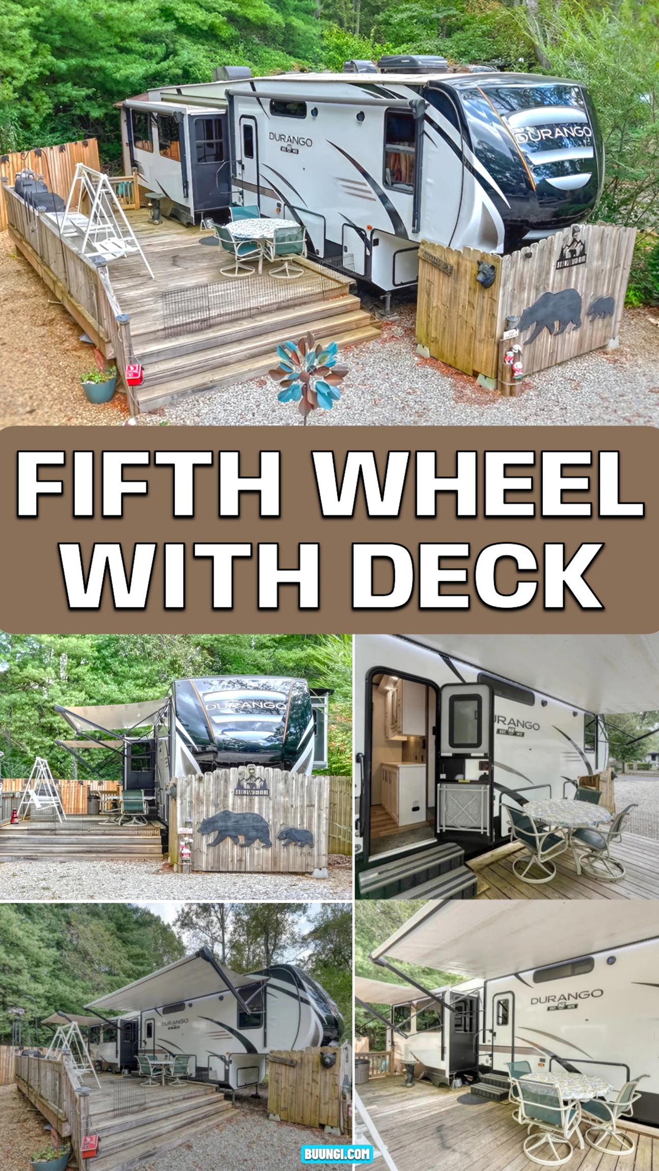 This fifth wheel setup with deck shows how to create a campsite that feels warm, useful, and easy to enjoy. The large wood deck acts like a true outdoor living room. The awnings create shade and comfort. The fence adds privacy and hides the less attractive parts of the RV. The gravel keeps maintenance simple. Then the extras, like the dining set, swing, grill, shed, and rustic accents, make the whole space feel complete.
