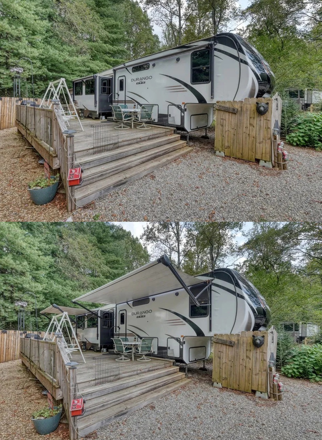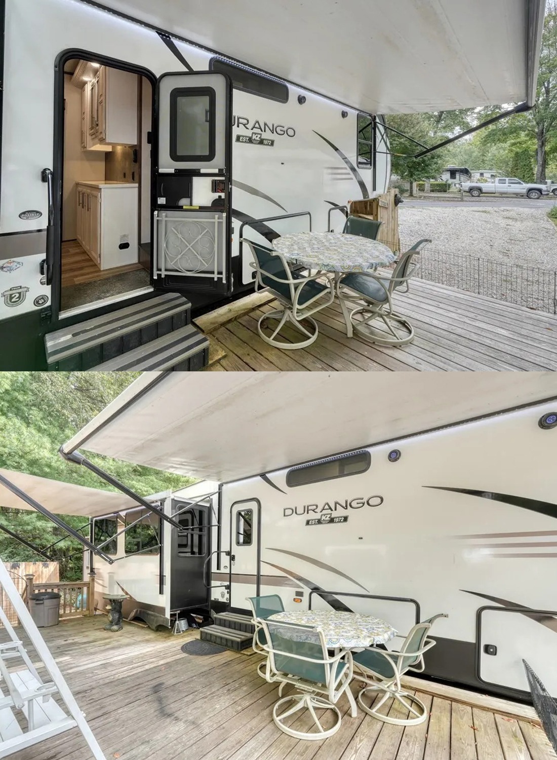 This Durango fifth wheel shows how a simple campsite can become a cozy retreat with a few smart choices. The deck creates a front porch feel. The fencing adds privacy and gives the site shape. The gravel keeps maintenance low. Meanwhile, the woods wrap the whole scene in a calm, cabin-like mood. As a result, the setup feels welcoming right away.