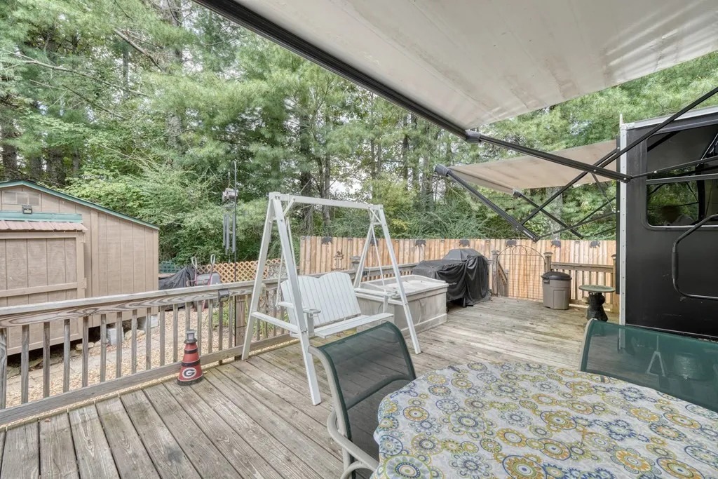 Here, the awnings stretch over the seating and dining area. That makes the deck more comfortable during hot afternoons and light rain. It also visually connects the RV and the deck, so the whole setup reads as one complete space.
