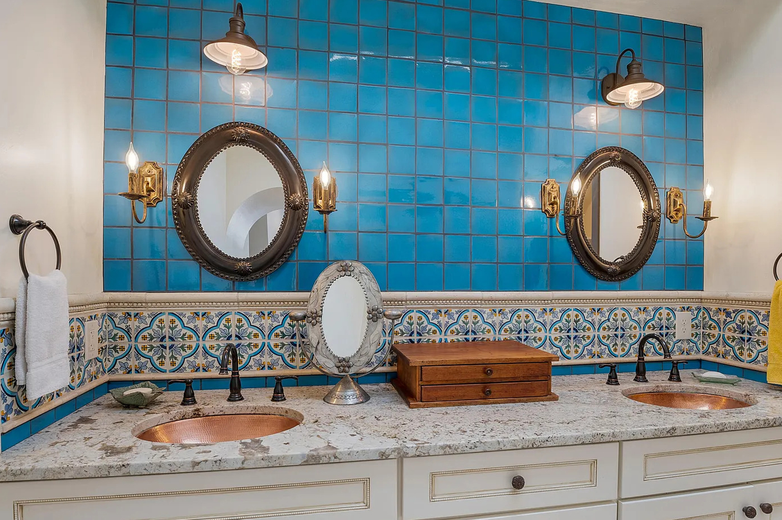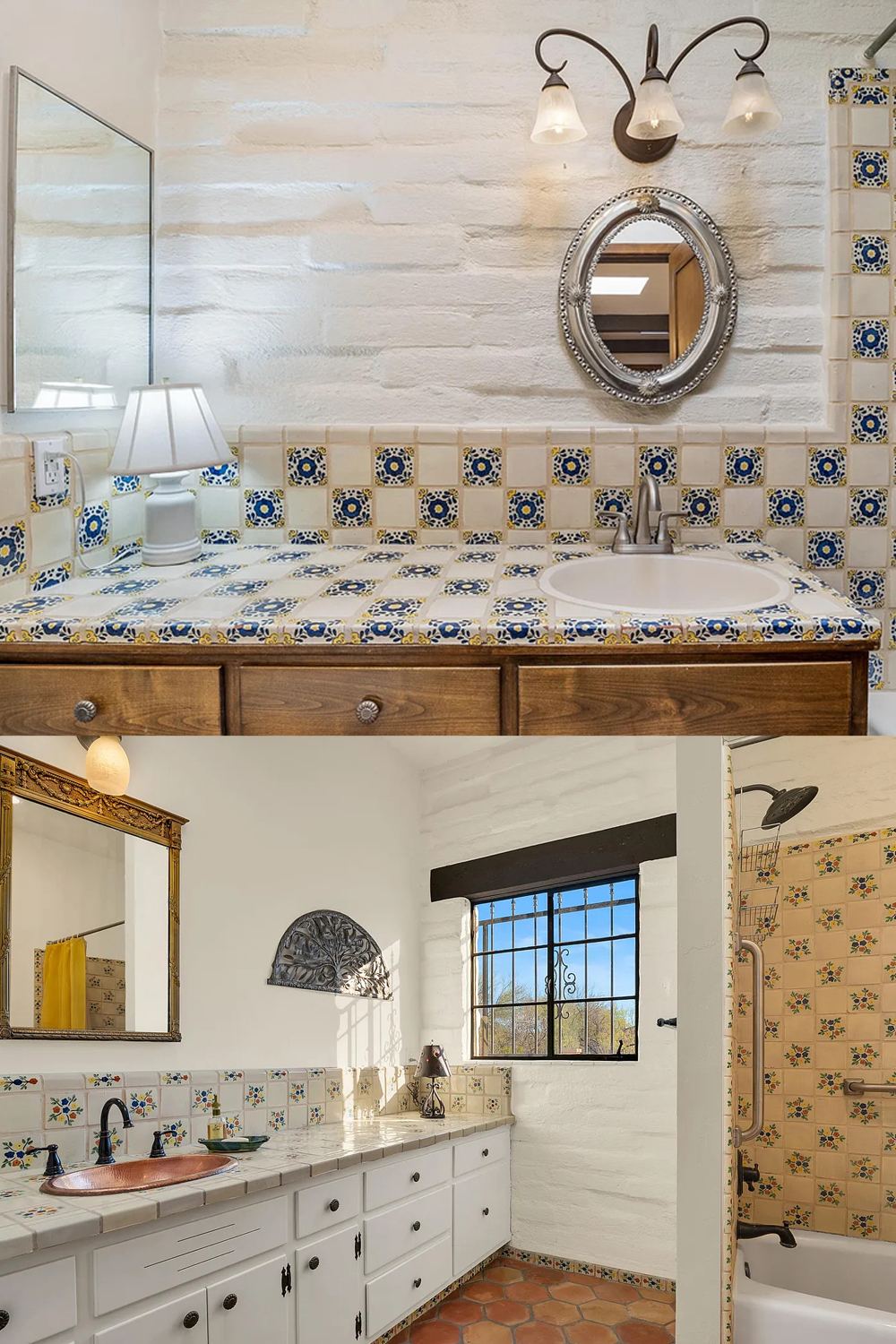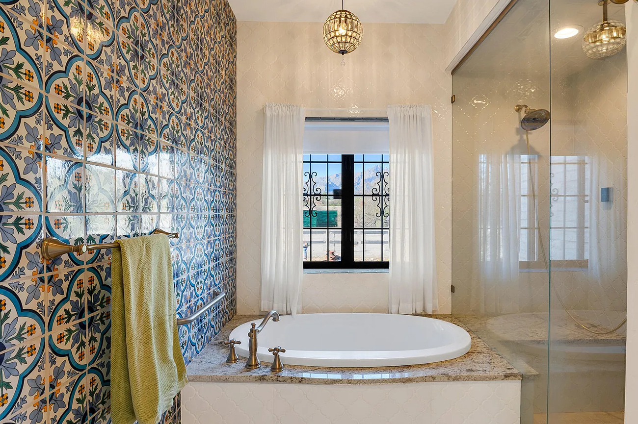 Bathrooms feel cheerful and artistic. Hand-painted Talavera tiles cover counters, walls, and showers. Blues, yellows, and greens bring life to every surface.