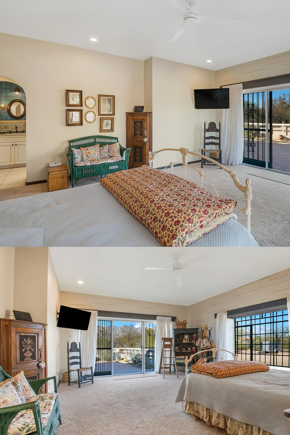 The bathrooms include deep soaking tubs with mountain views. Terracotta tile floors and built-in storage keep the space both lovely and useful.