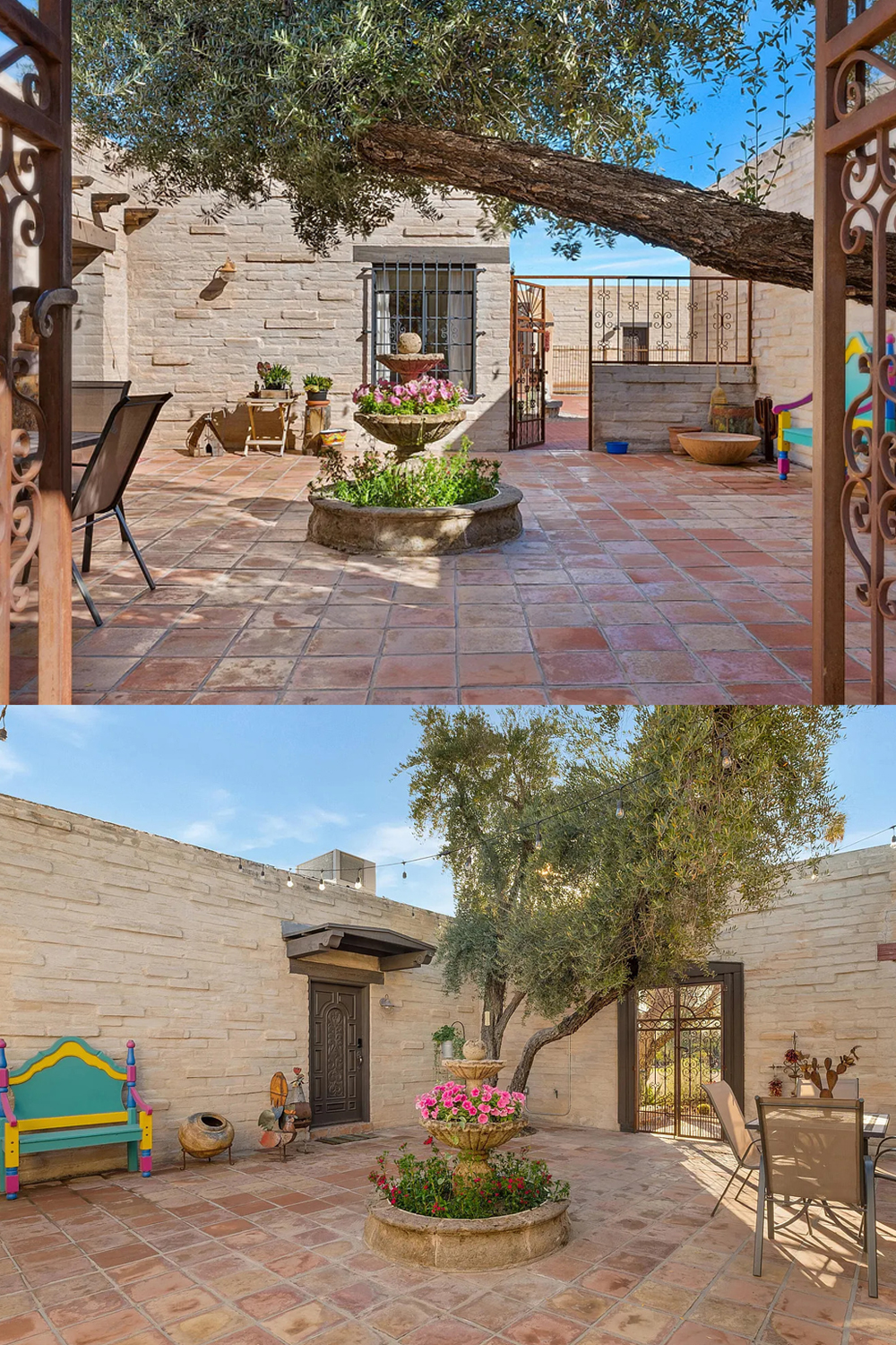Step through the iron gates and enter the courtyard. Warm terracotta tiles cover the ground. Their color shifts with the light. A fountain sits at the center and fills the air with gentle sound. The space feels peaceful and private.