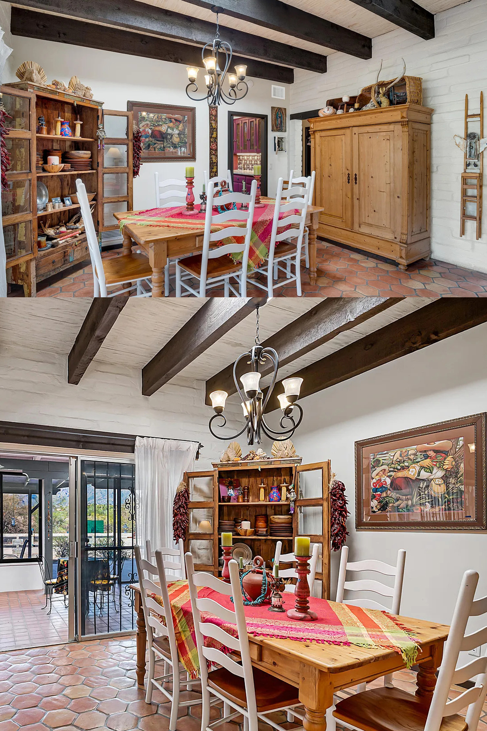The dining area blends rustic charm with warmth. A solid wood table anchors the space. Ladder-back chairs keep the look casual and inviting. Bright woven runners add color against terracotta tile floors.