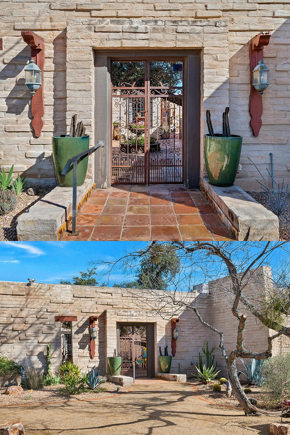 The walkway curves as it leads you inside. Desert plants and stone line the path. Hand-forged iron details and warm tile underfoot show care and craftsmanship. Side gates mark the move from public to private spaces. They add beauty and security at the same time.