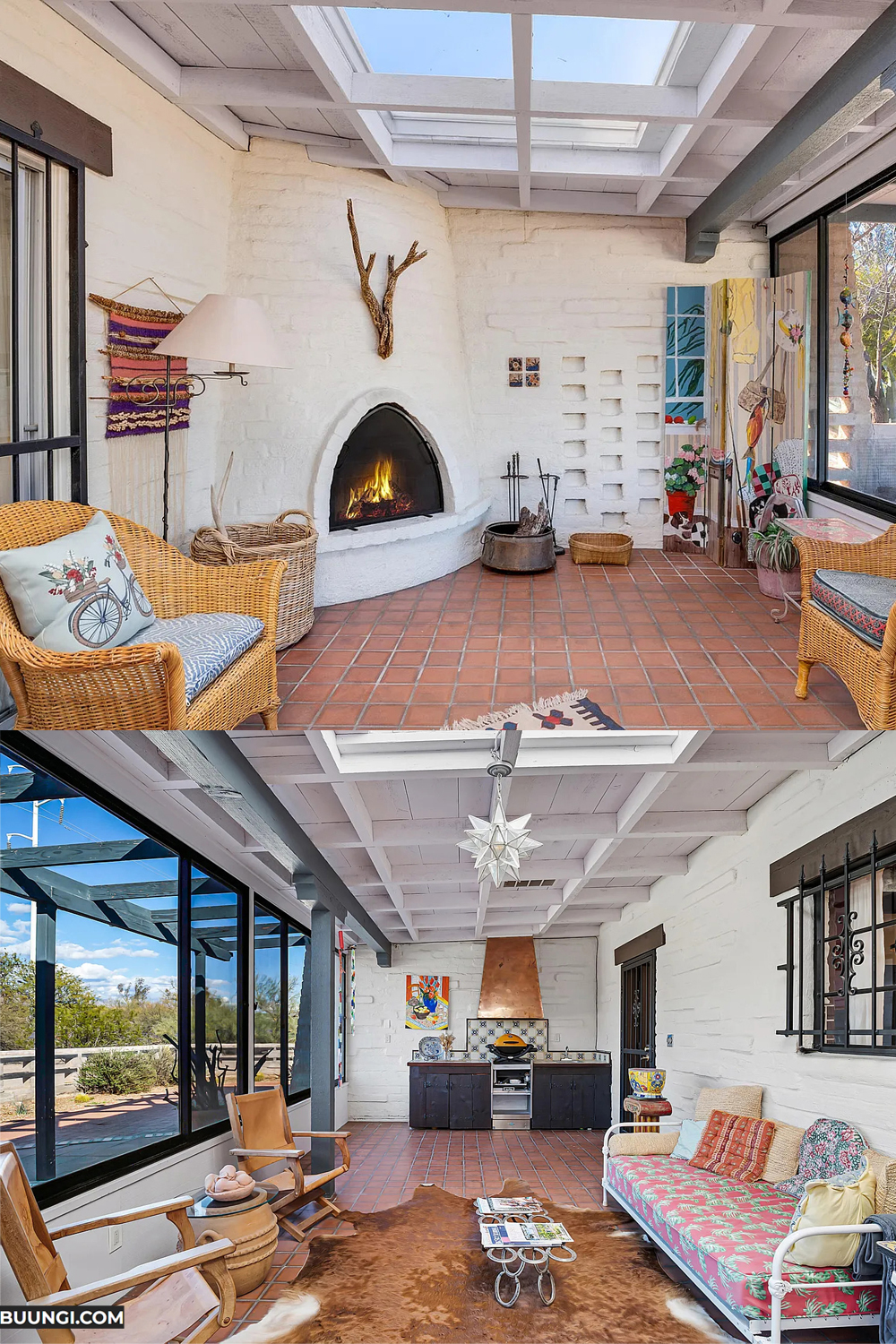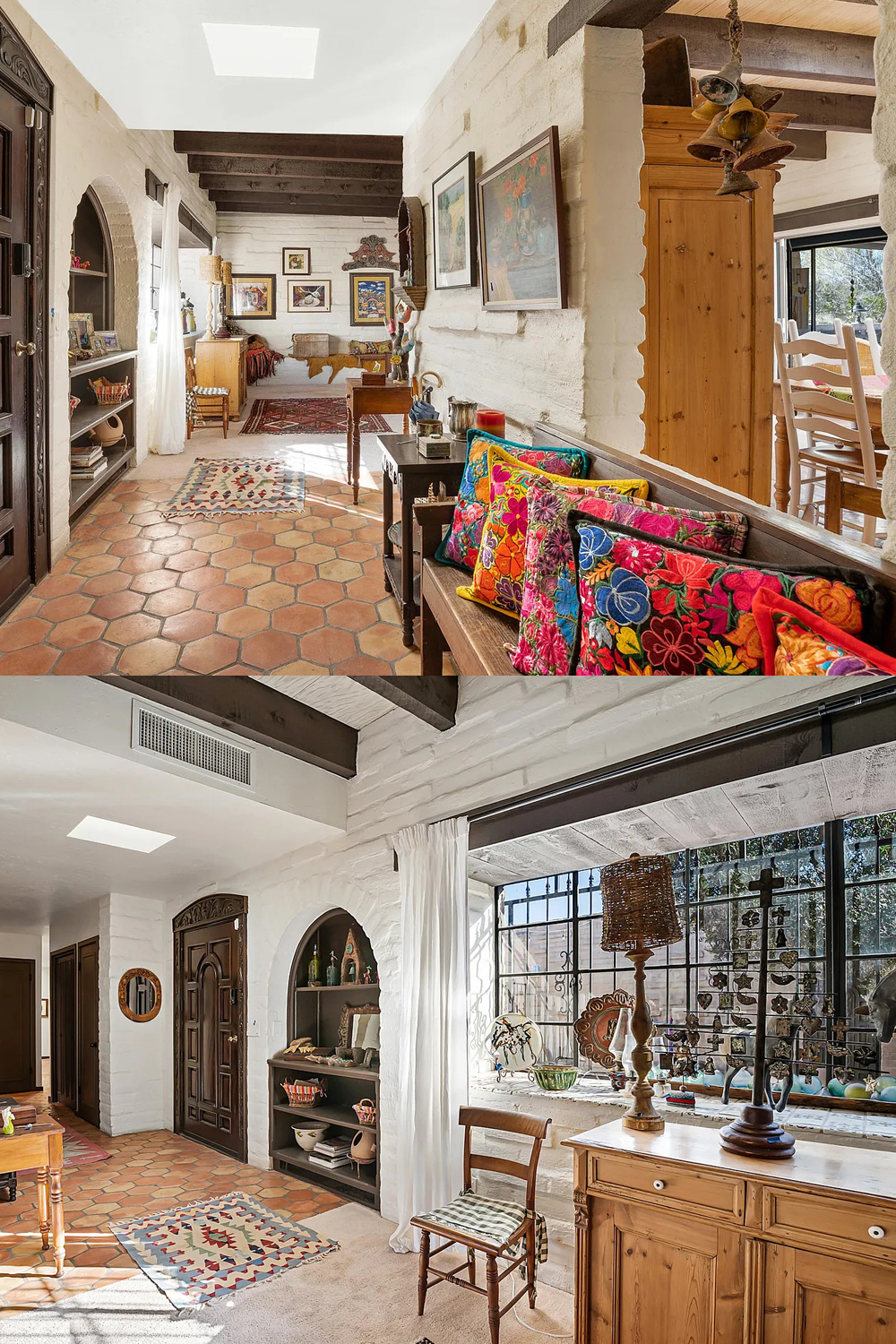 From the lively kitchens to the cozy living room and peaceful bedrooms, everything feels thoughtful. This hacienda shows that a home can feel warm, creative, and deeply comforting—all at once.