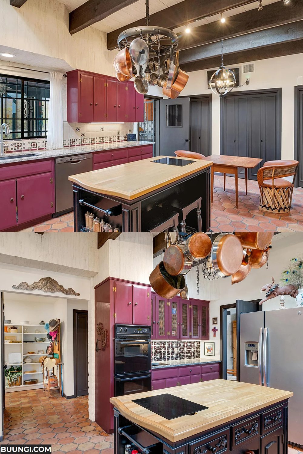 The second kitchen goes deeper with rich raspberry cabinets. A smooth granite counter tops a central island made for gathering. Copper pots hang overhead and shine in the light. Patterned tiles turn small details into focal points.