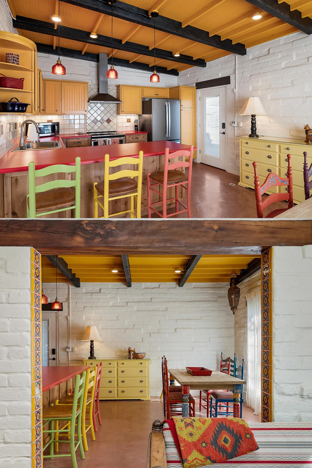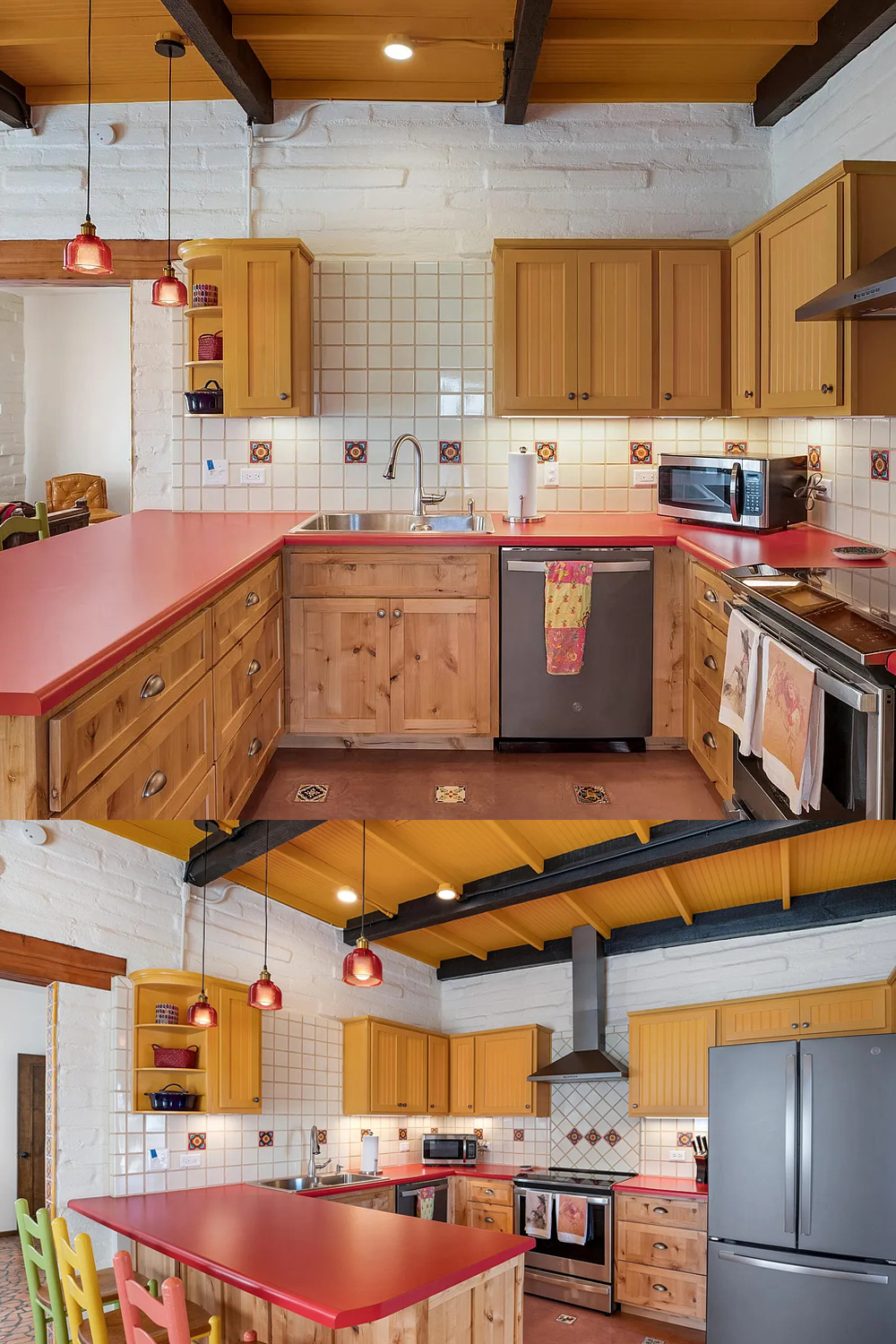 Both kitchens feel joyful and full of life. One kitchen features gold cabinets and a warm red counter. Bar stools pop in yellow, coral, and green.
