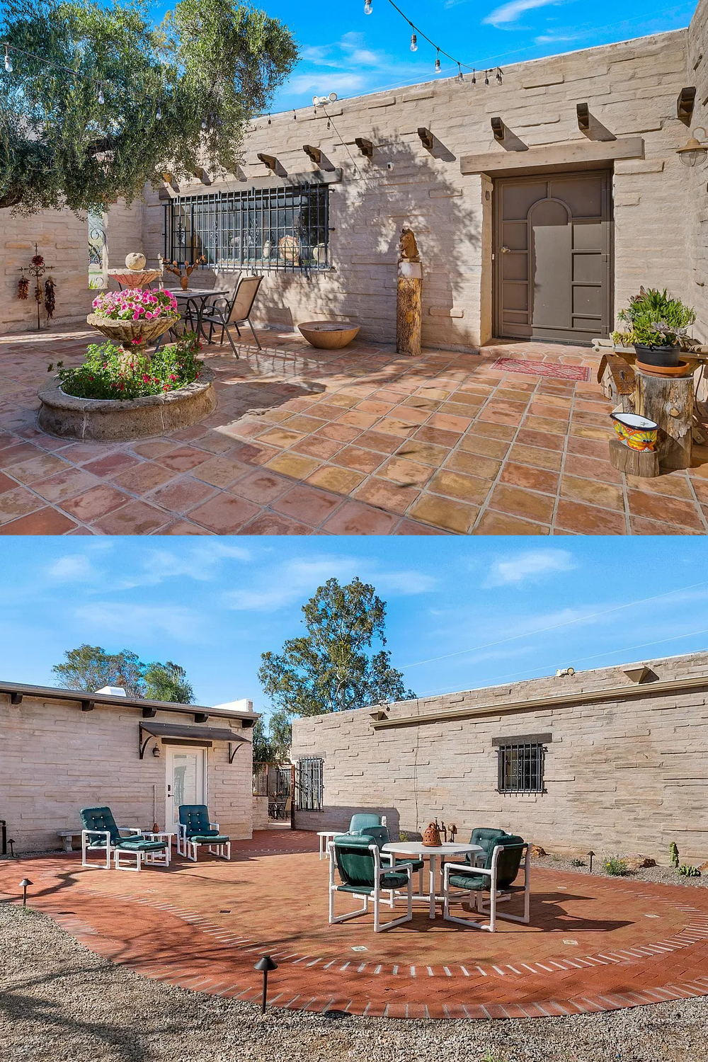 Hacienda homes celebrate outdoor life. This one does it well. Several patios wrap around the home. Each one feels a little different. Curved brick patterns define areas for dining or relaxing. Deep green cushions add comfort and contrast.